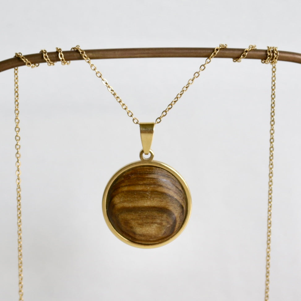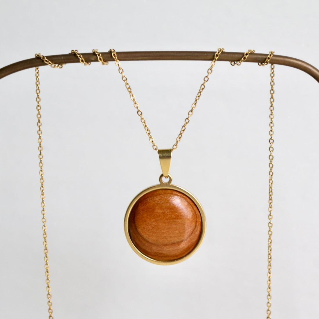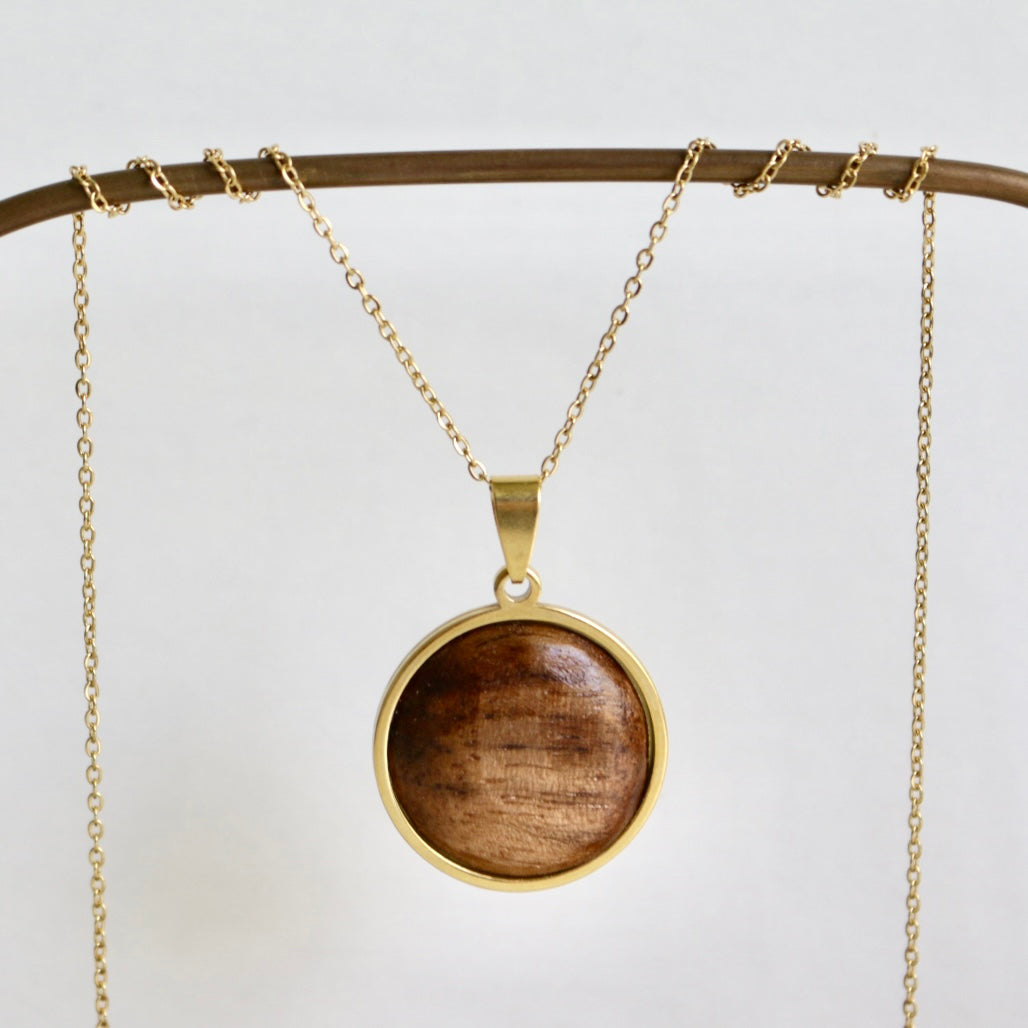 The Camille Necklace is handmade using recycled wood from local woodworkers scraps. We use high quality hypoallergenic stainless steel metals. 14K gold filled and sterling silver available upon request. Each piece measures 1” in diameter. This necklace comes on an adjustable chain 14”-18” in length.