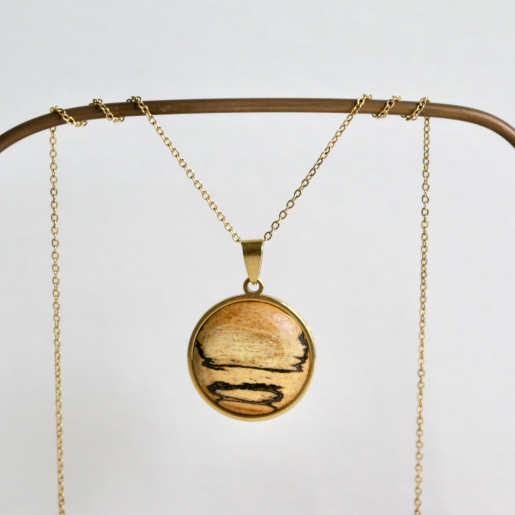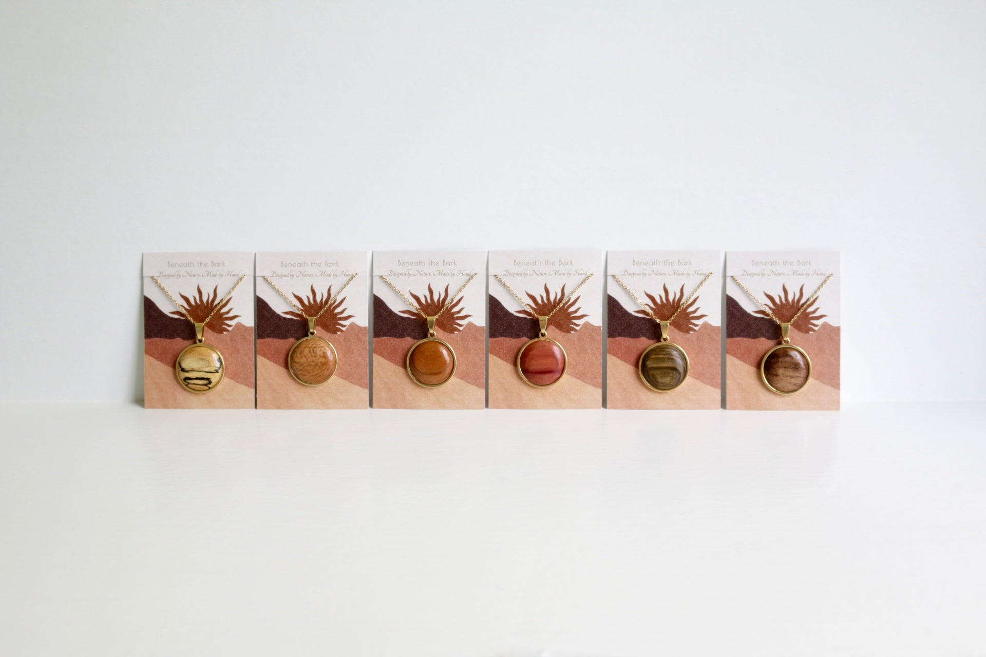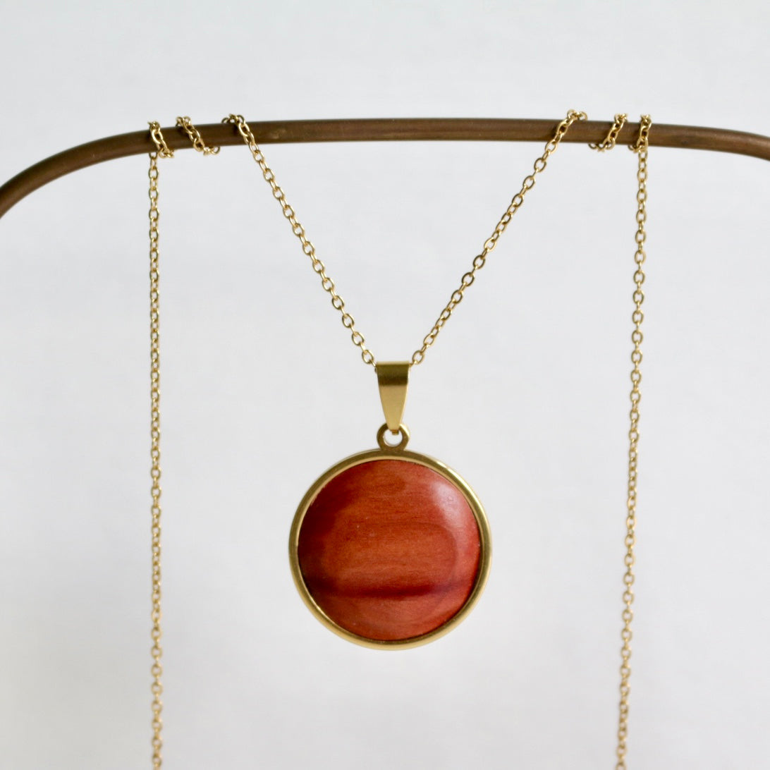 The Camille Necklace is handmade using recycled wood from local woodworkers scraps. We use high quality hypoallergenic stainless steel metals. 14K gold filled and sterling silver available upon request. Each piece measures 1” in diameter. This necklace comes on an adjustable chain 14”-18” in length.