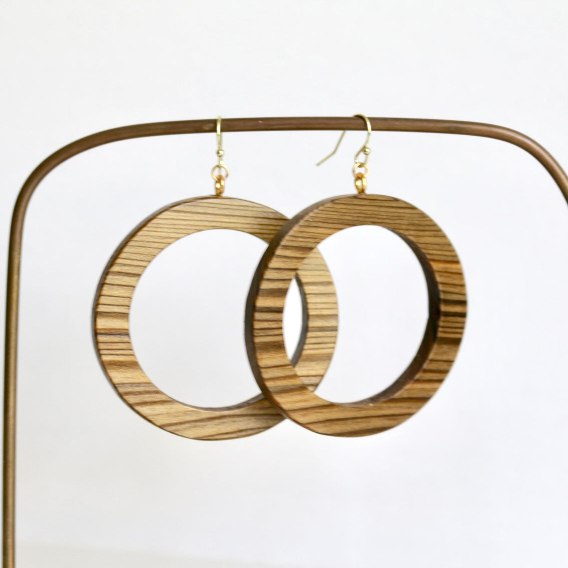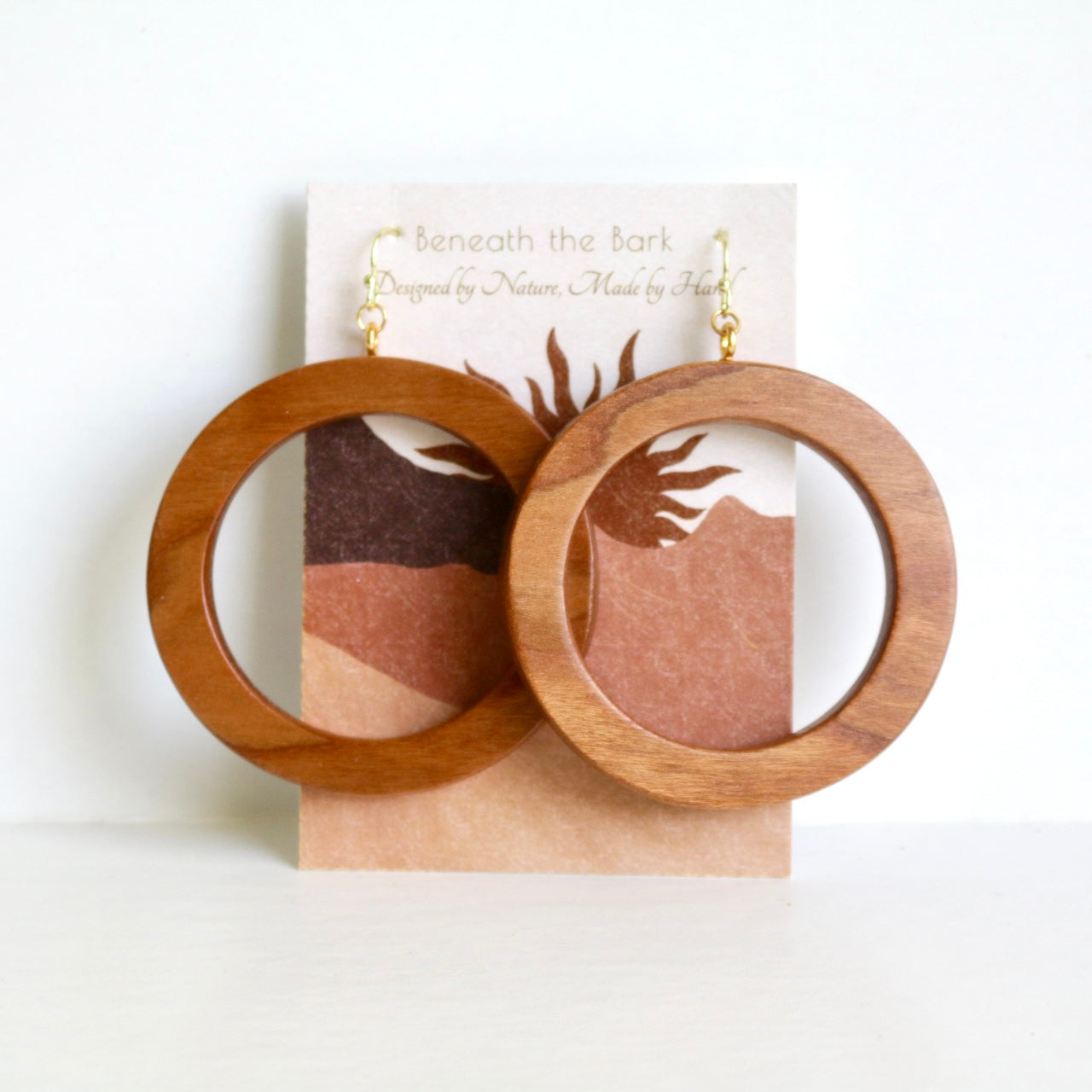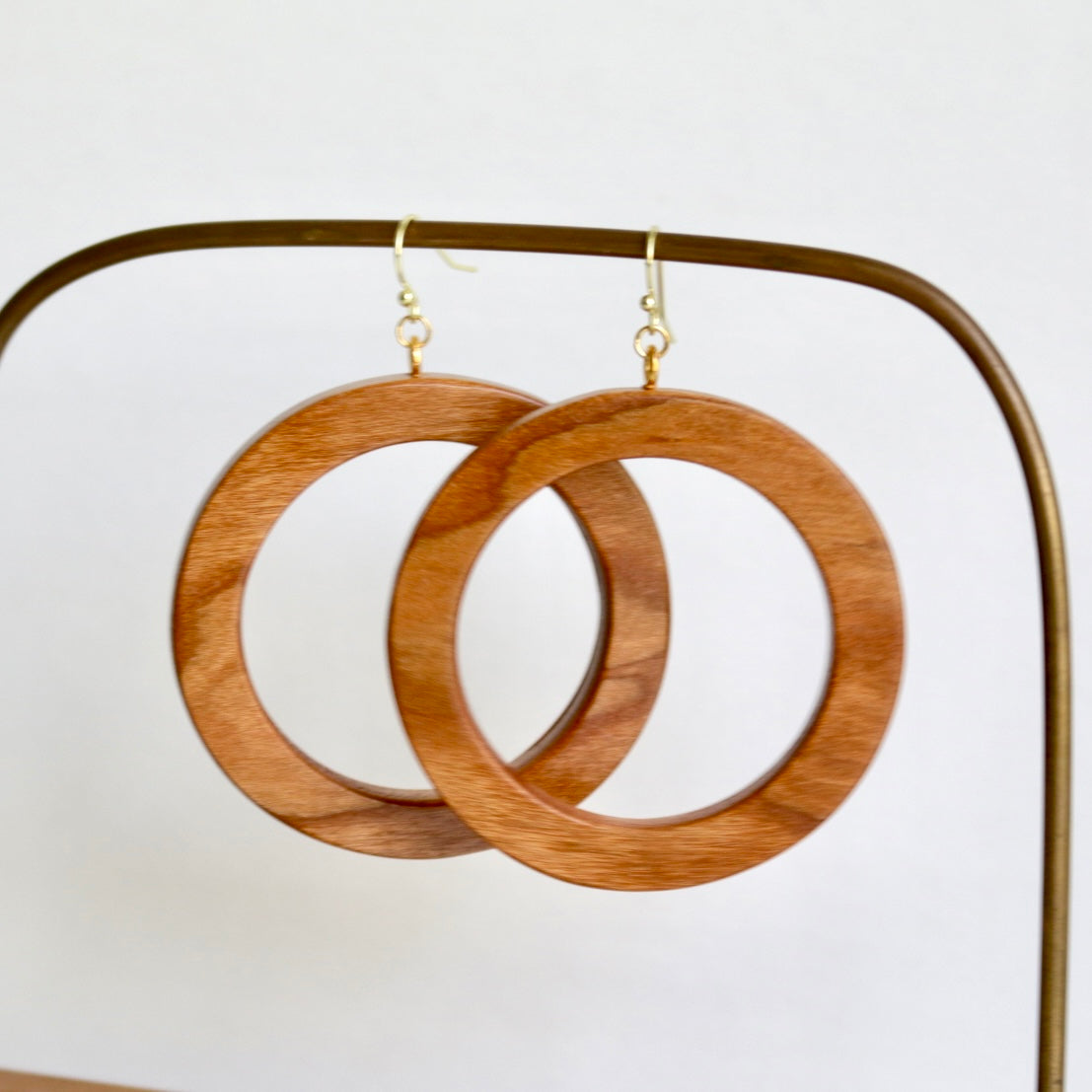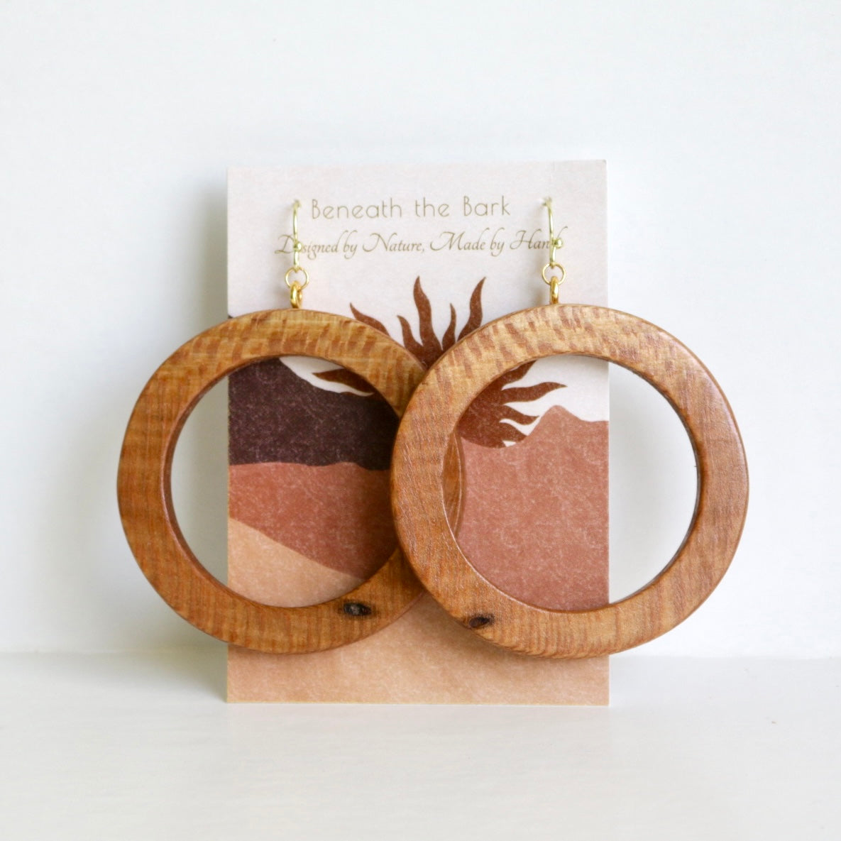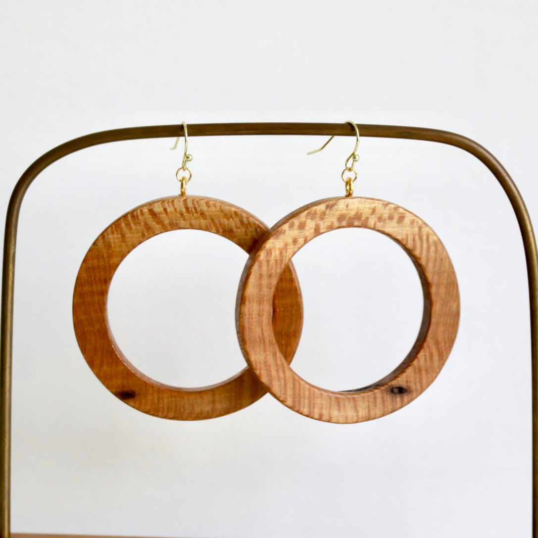 The Caroline hoops are handmade using salvaged wood and high quality hypoallergenic 18K gold stainless steel ear posts. 14K gold filled and sterling silver available upon request. These statement earrings are super lightweight and measure 2.5” in outer diameter.
