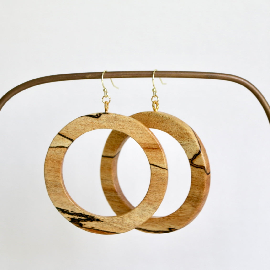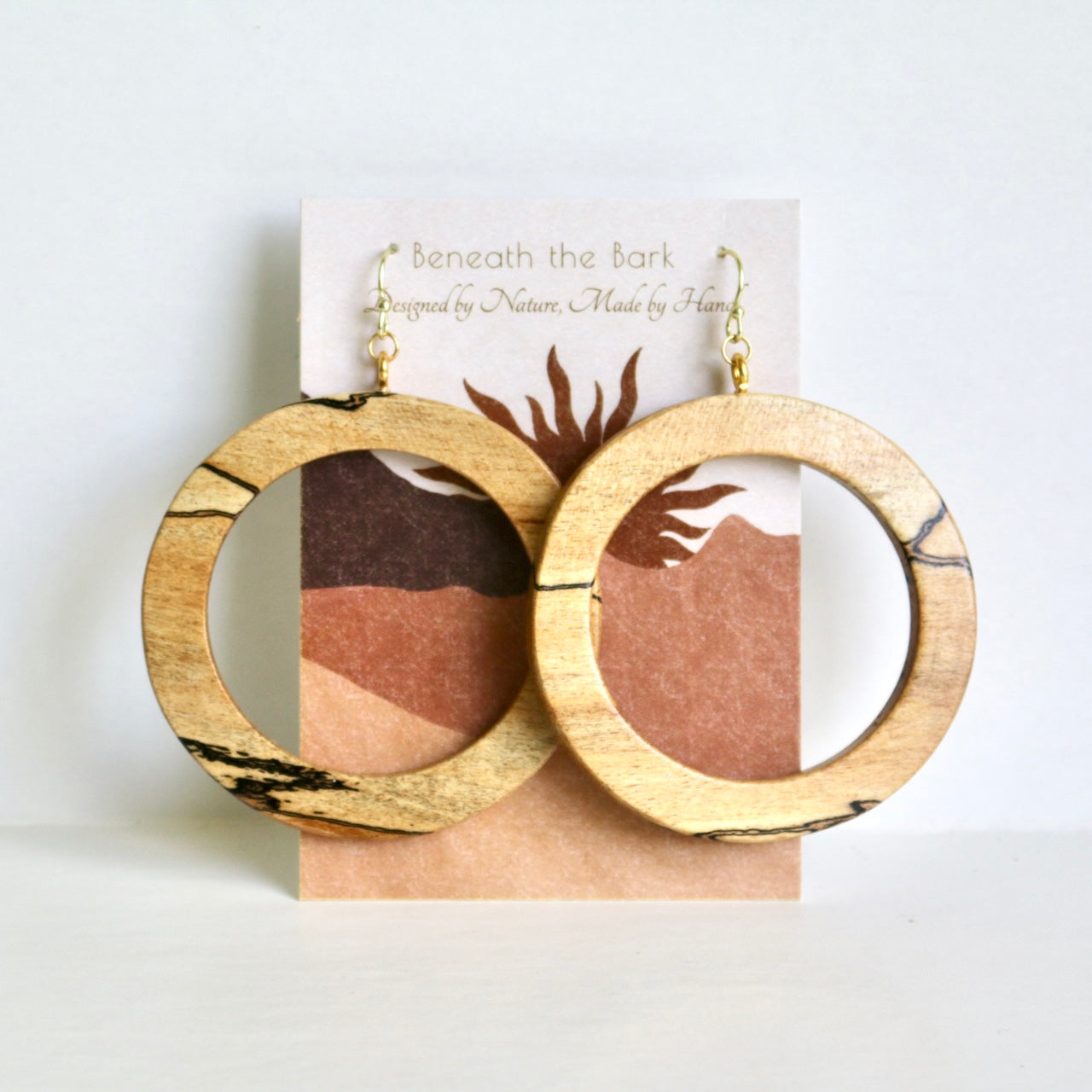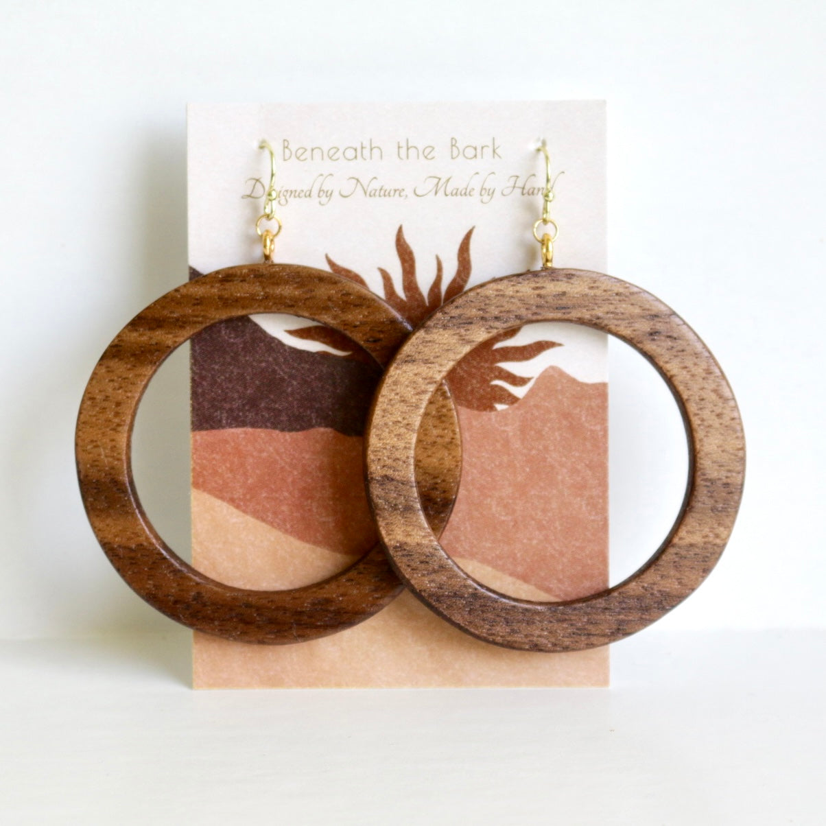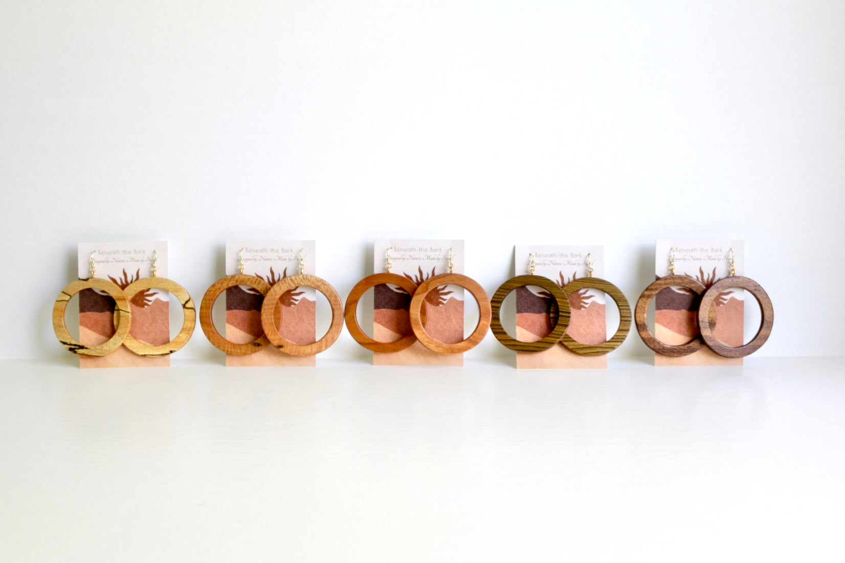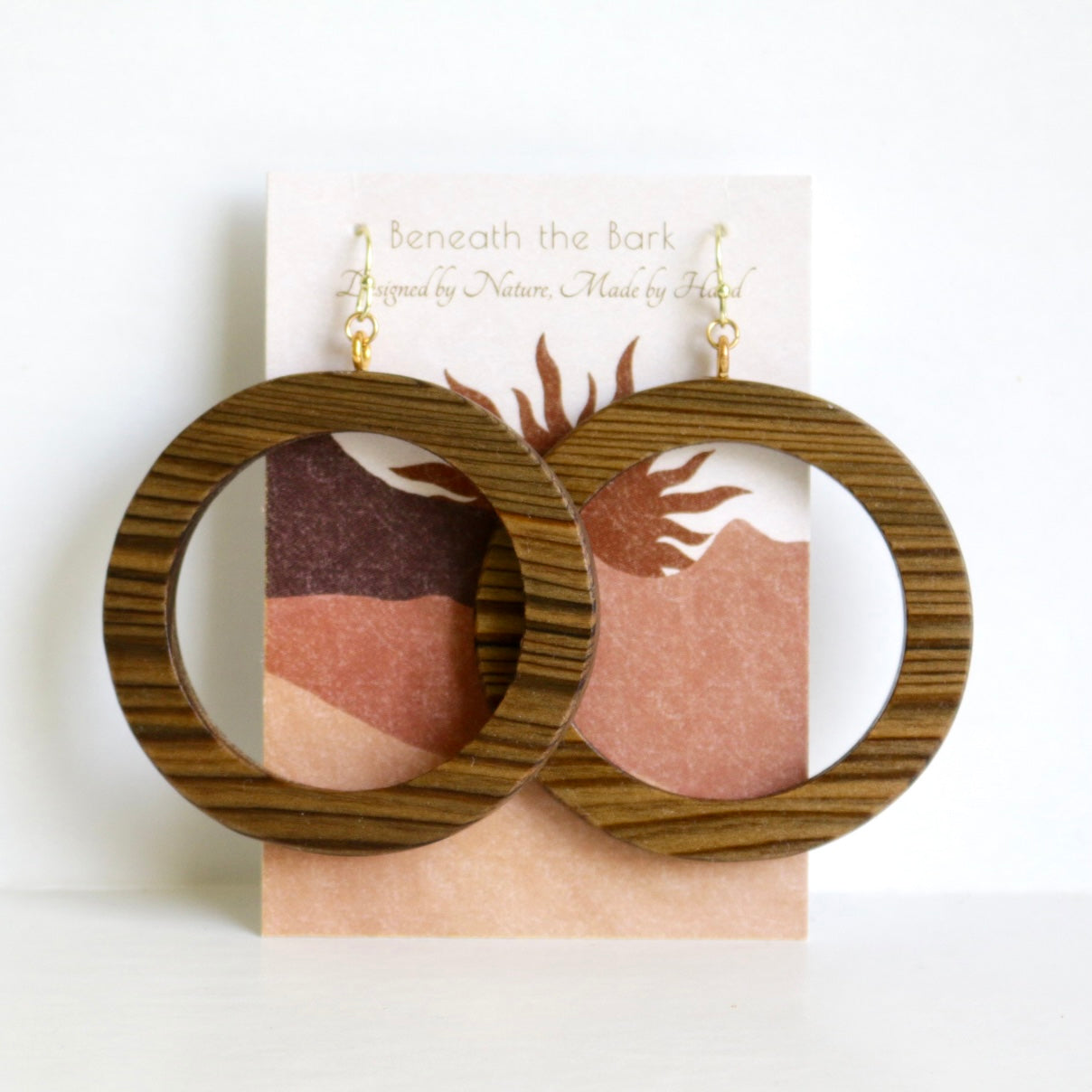 The Caroline hoops are handmade using salvaged wood and high quality hypoallergenic 18K gold stainless steel ear posts. 14K gold filled and sterling silver available upon request. These statement earrings are super lightweight and measure 2.5” in outer diameter.