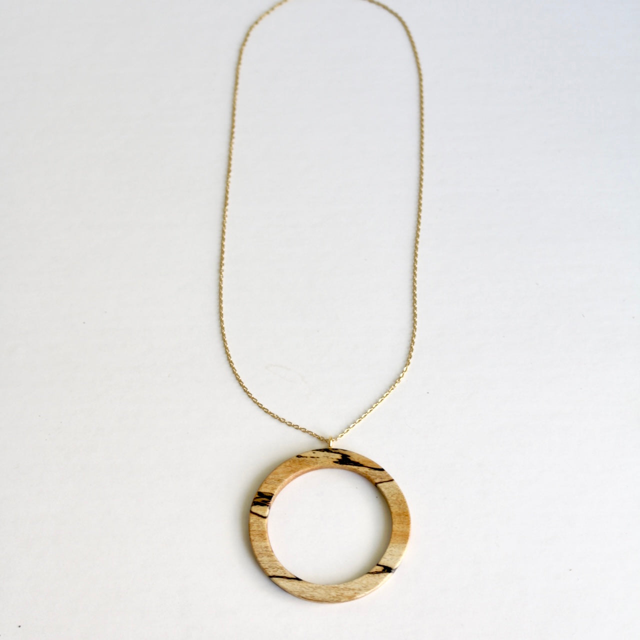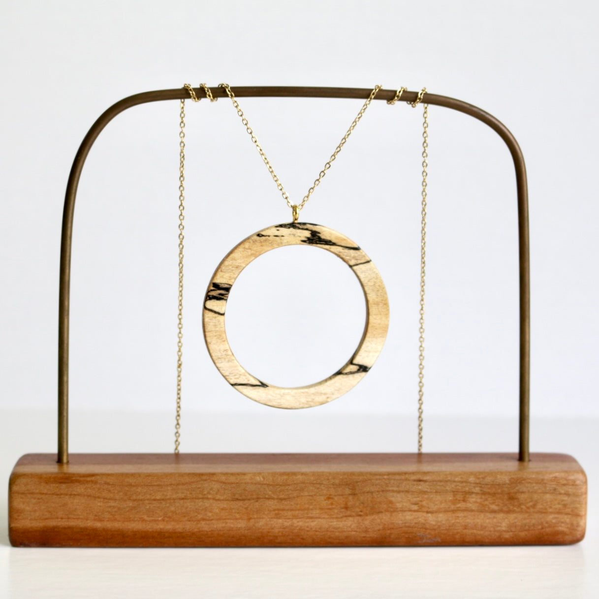 The Caroline necklace is handmade using recycled wood from woodworkers scraps. We use high quality hypoallergenic stainless steel metals. This necklace measures 2.25” in outer diameter. This necklace is adjustable and can be worn 14”-18” in length. 14K gold filled and sterling silver available upon request.