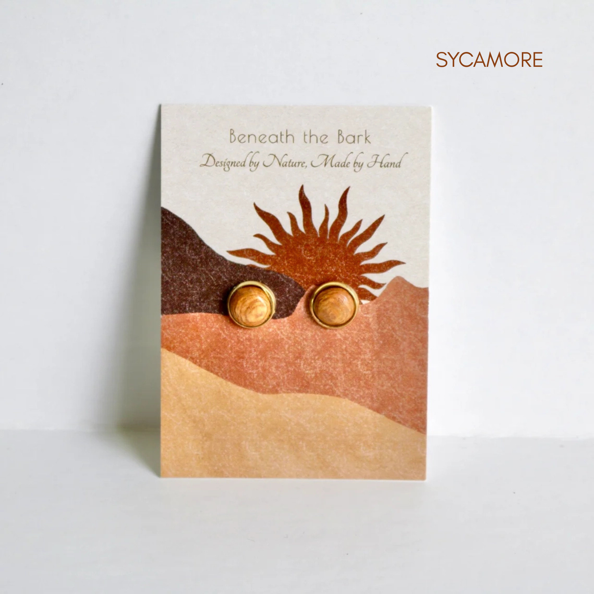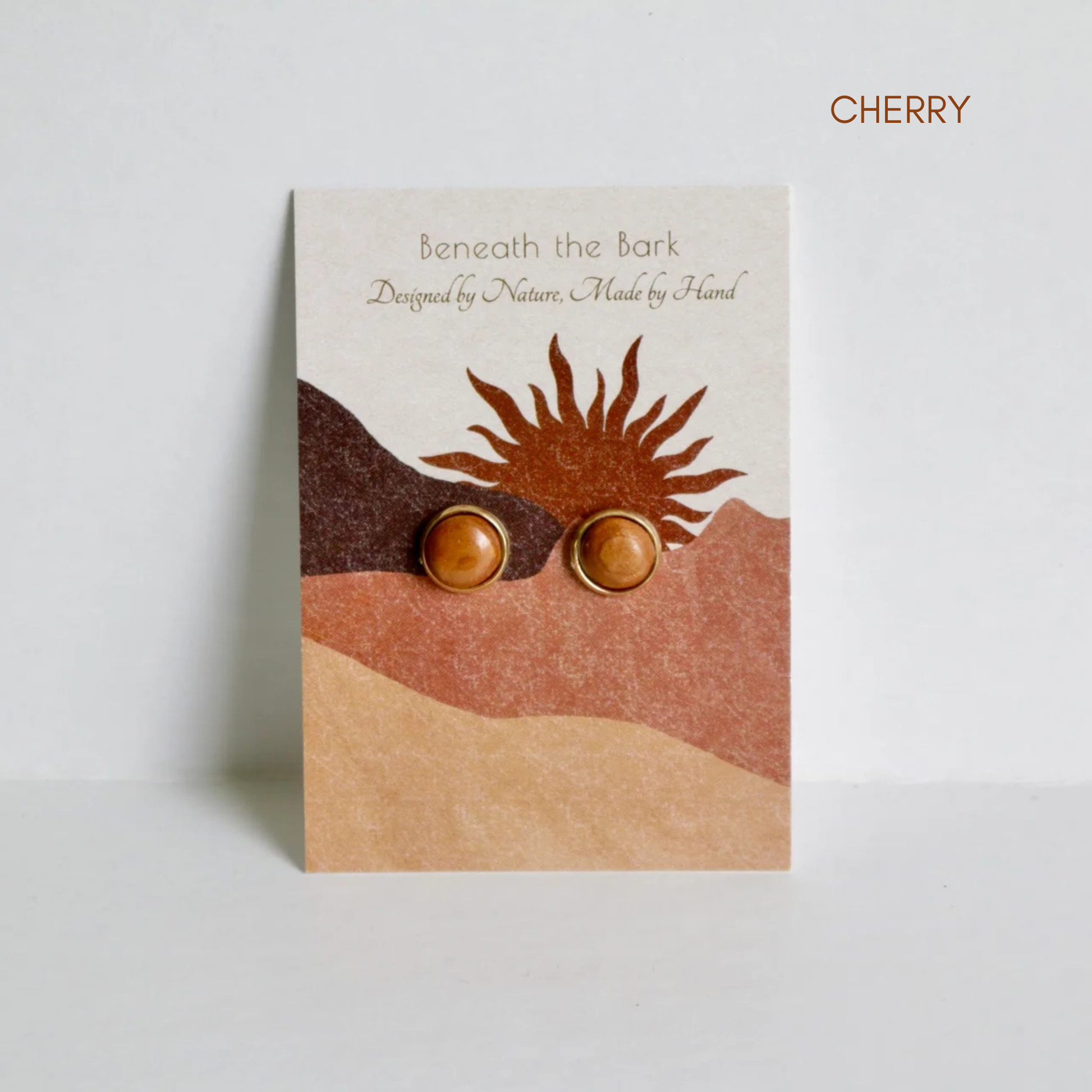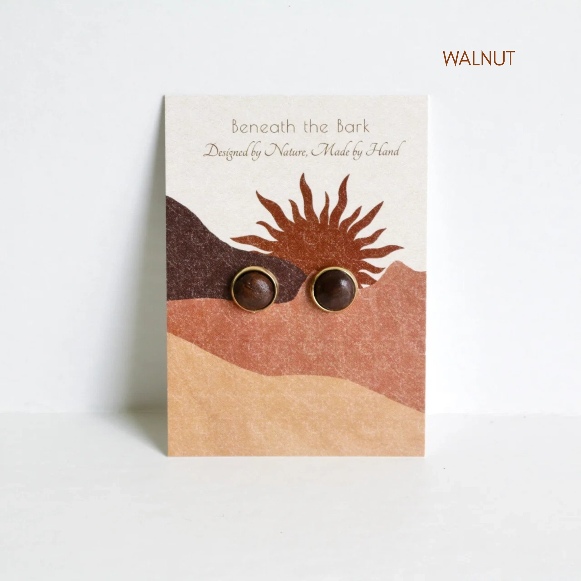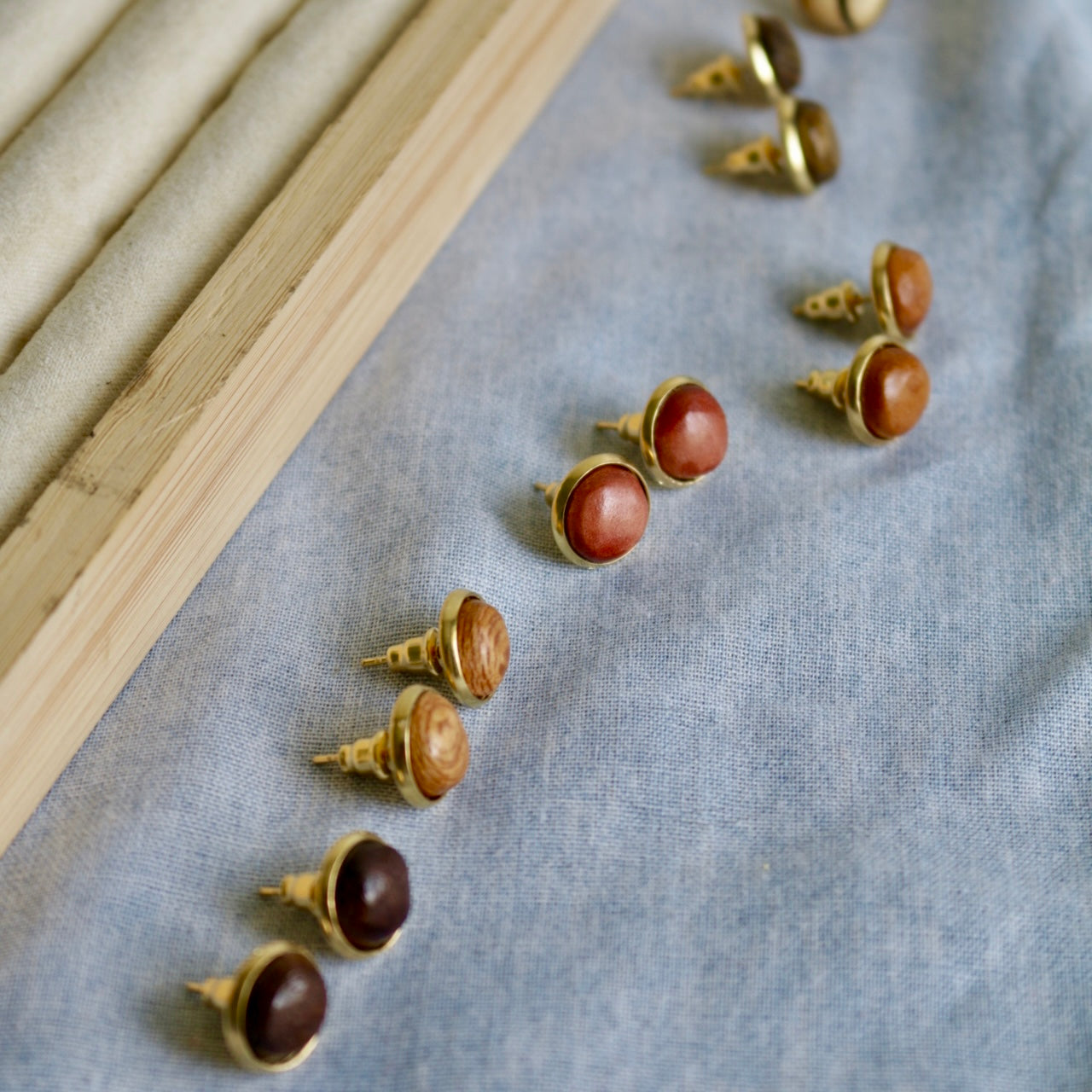 Our circle studs are handmade from salvaged wood and measure about 10mm. These earrings are made with high quality hypoallergenic 18K gold plated stainless steel ear posts.