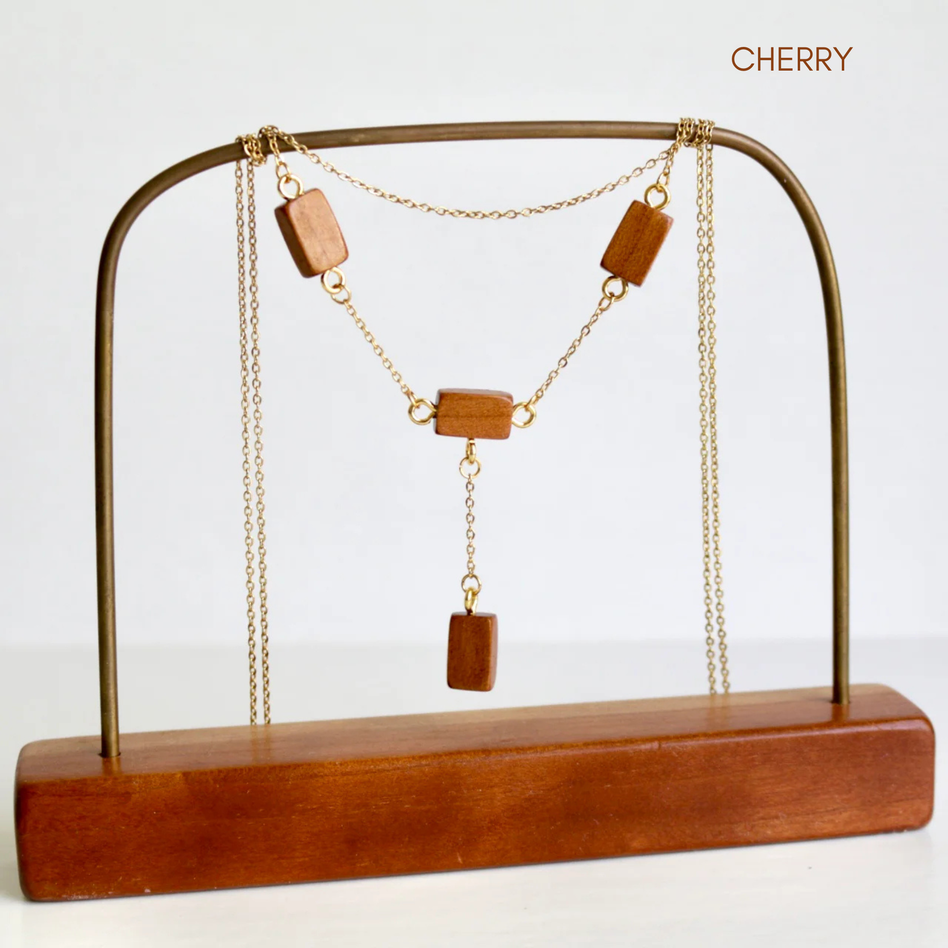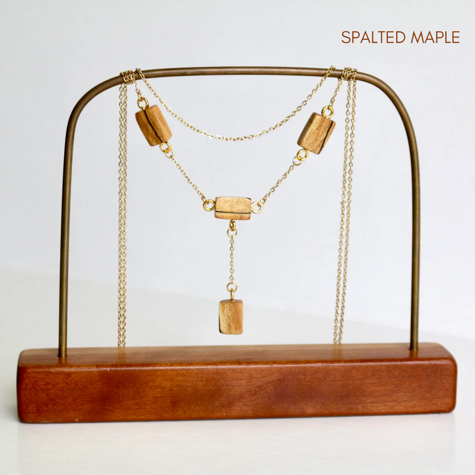 The Dakota necklace is a customer favorite! This necklace is handmade using recycled wood from woodworkers scraps. We use high quality hypoallergenic stainless steel metals. 14K gold filled and sterling silver available upon request. Lightweight and one of a kind. This necklace has a double chain and is adjustable from 14"-18" in length.