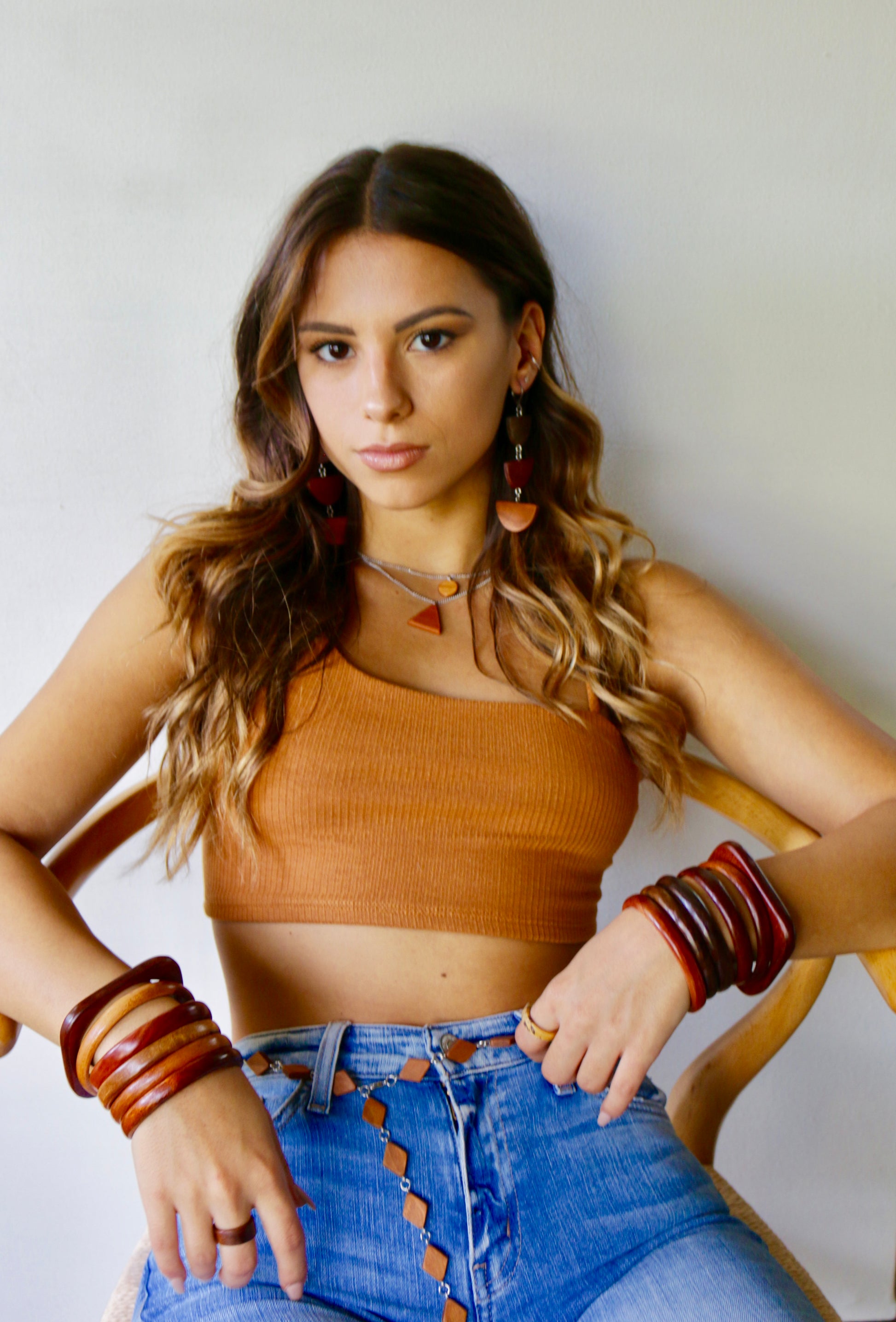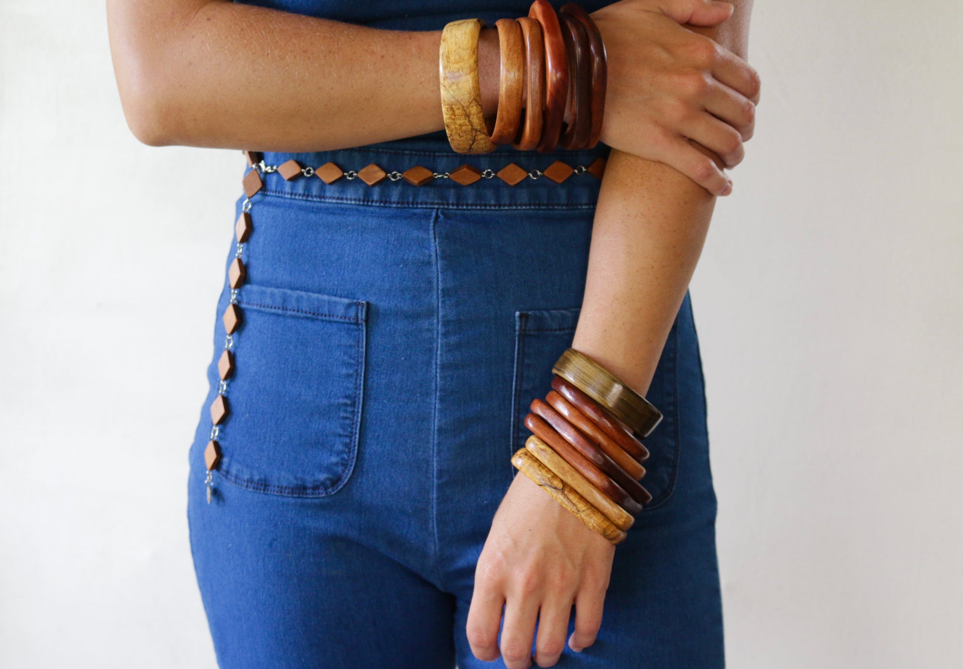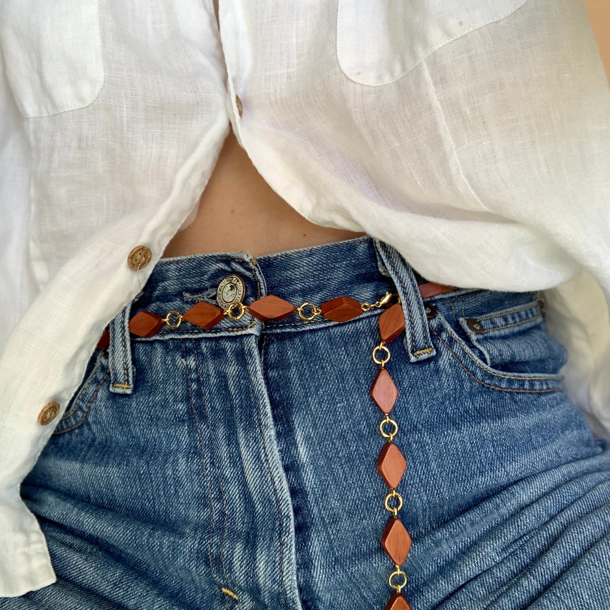 The Marsha belt is handmade using recycled cherry wood from woodworkers scraps. We use high quality hypoallergenic stainless steel metals. Lightweight and one of a kind. Guaranteed to turn heads.