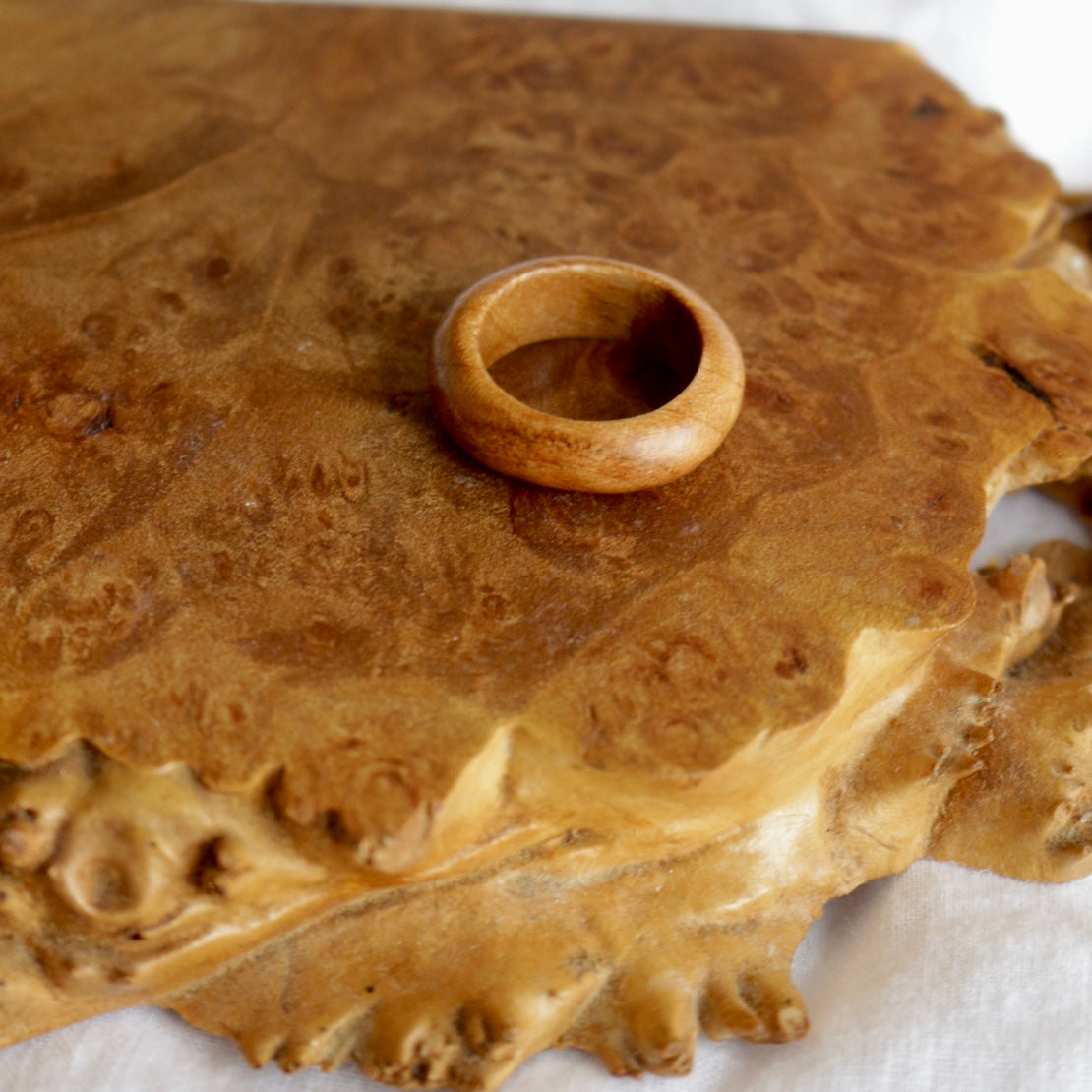 This ring is handmade using recycled cherry wood from woodworkers scraps. Each piece is hand cut, sanded and finished with organic oils to preserve the woods natural beauty.