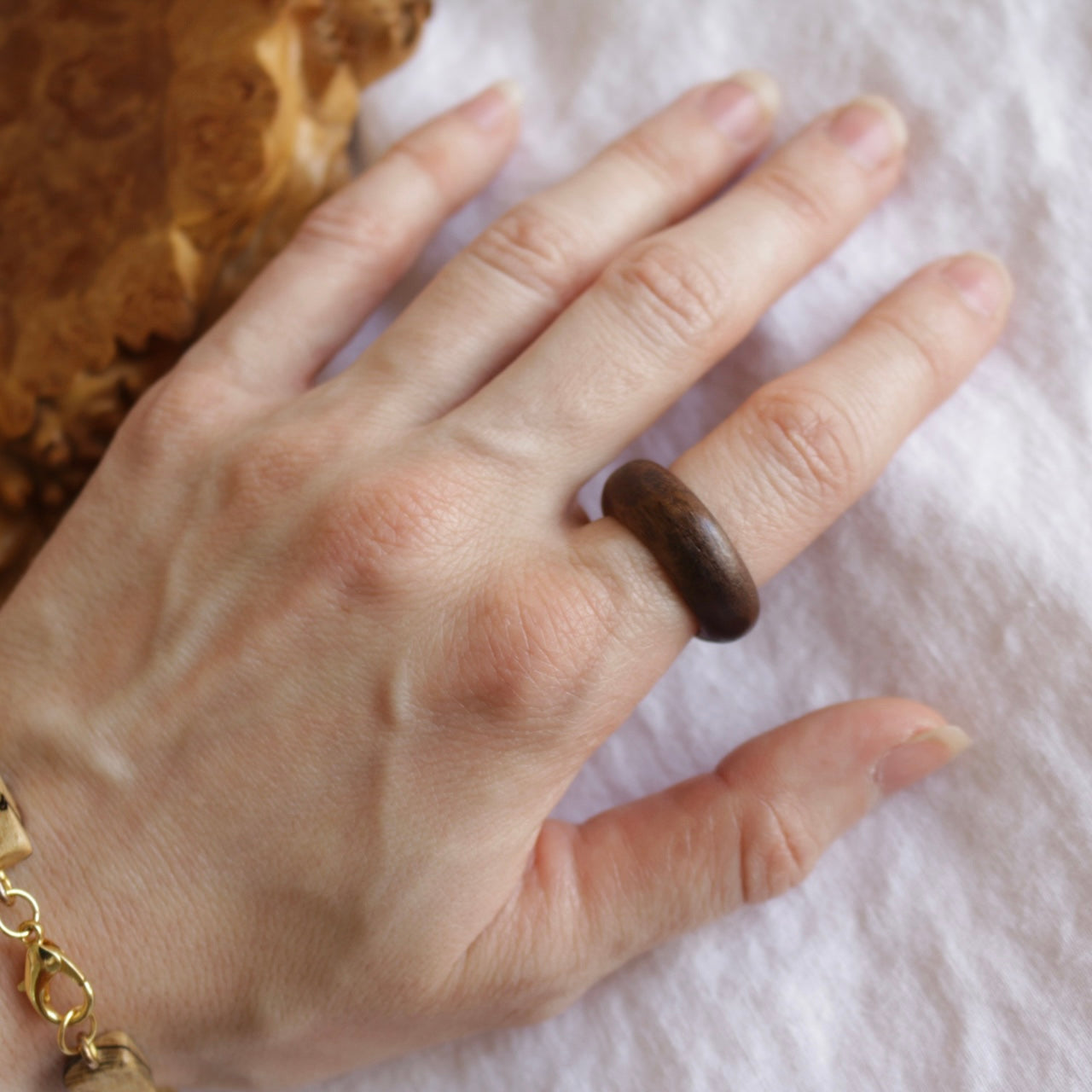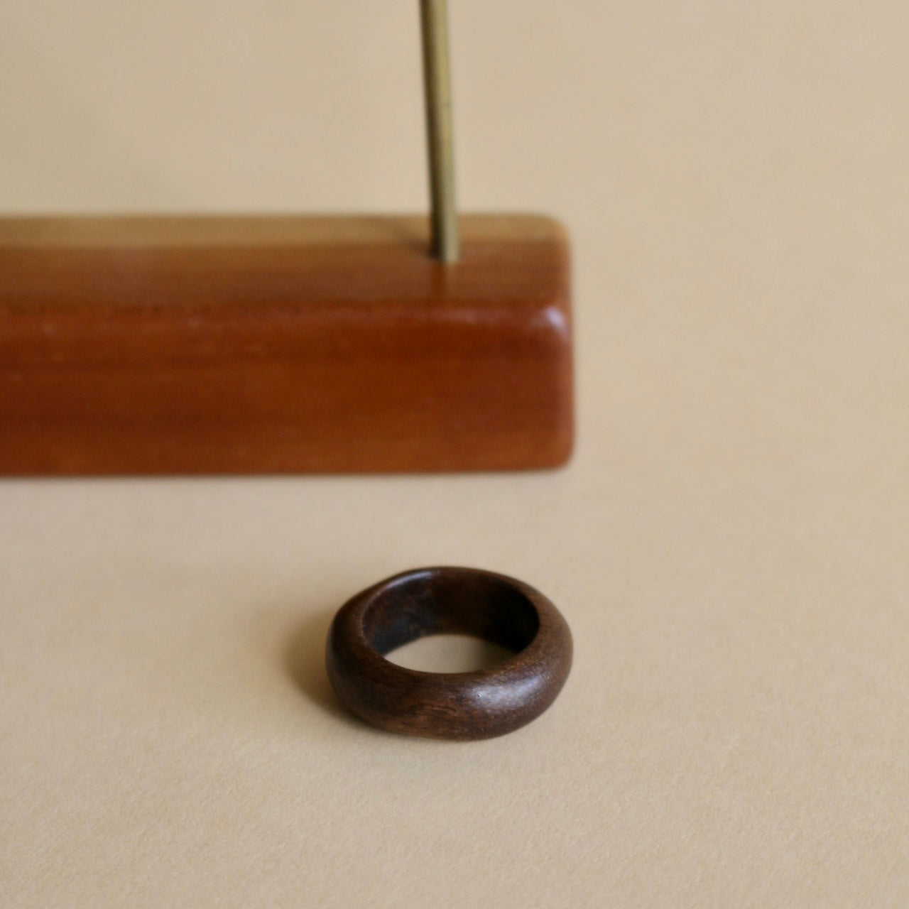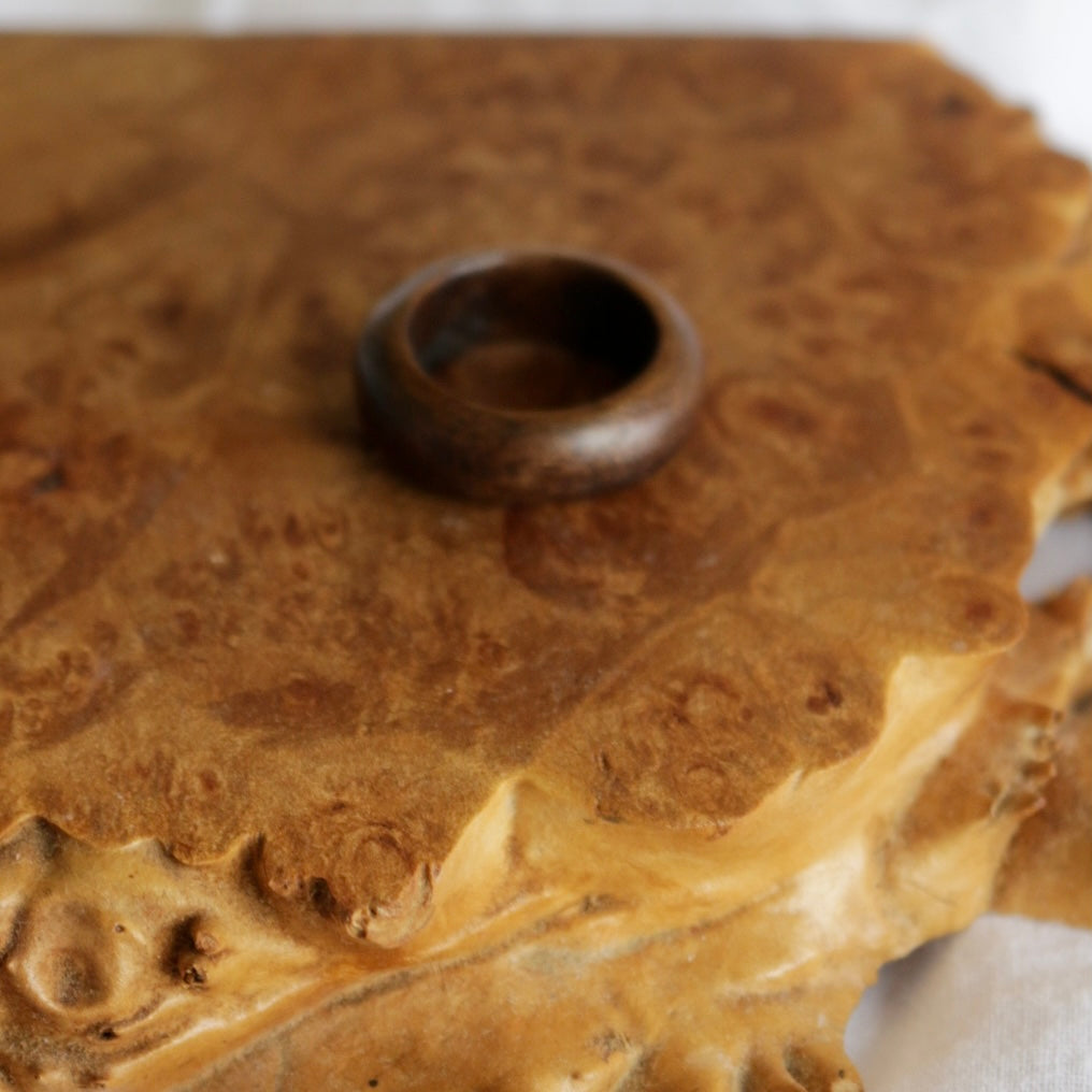 This ring is handmade using recycled walnut wood from woodworkers scraps. Each piece is hand cut, sanded and finished with organic oils to preserve the woods natural beauty.