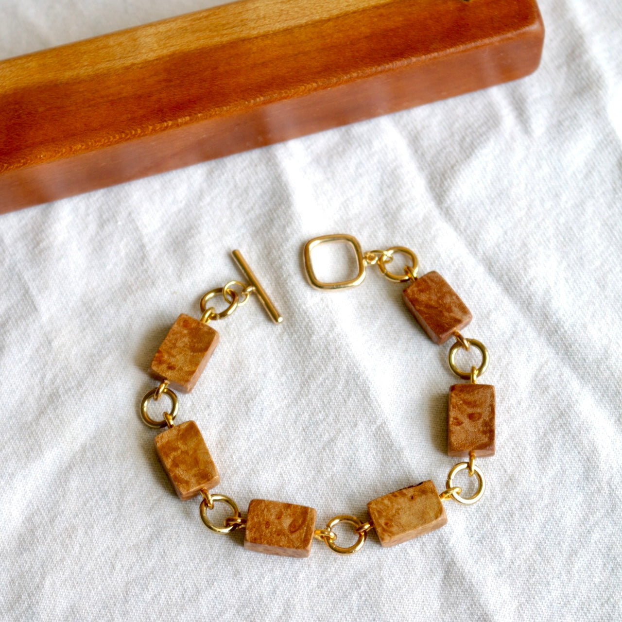 The Sadie bracelet is handmade using recycled wood from woodworkers scraps. We use high quality stainless steel metals. This bracelet measures 7.5” in length with an extender chain. Lightweight and one of a kind.