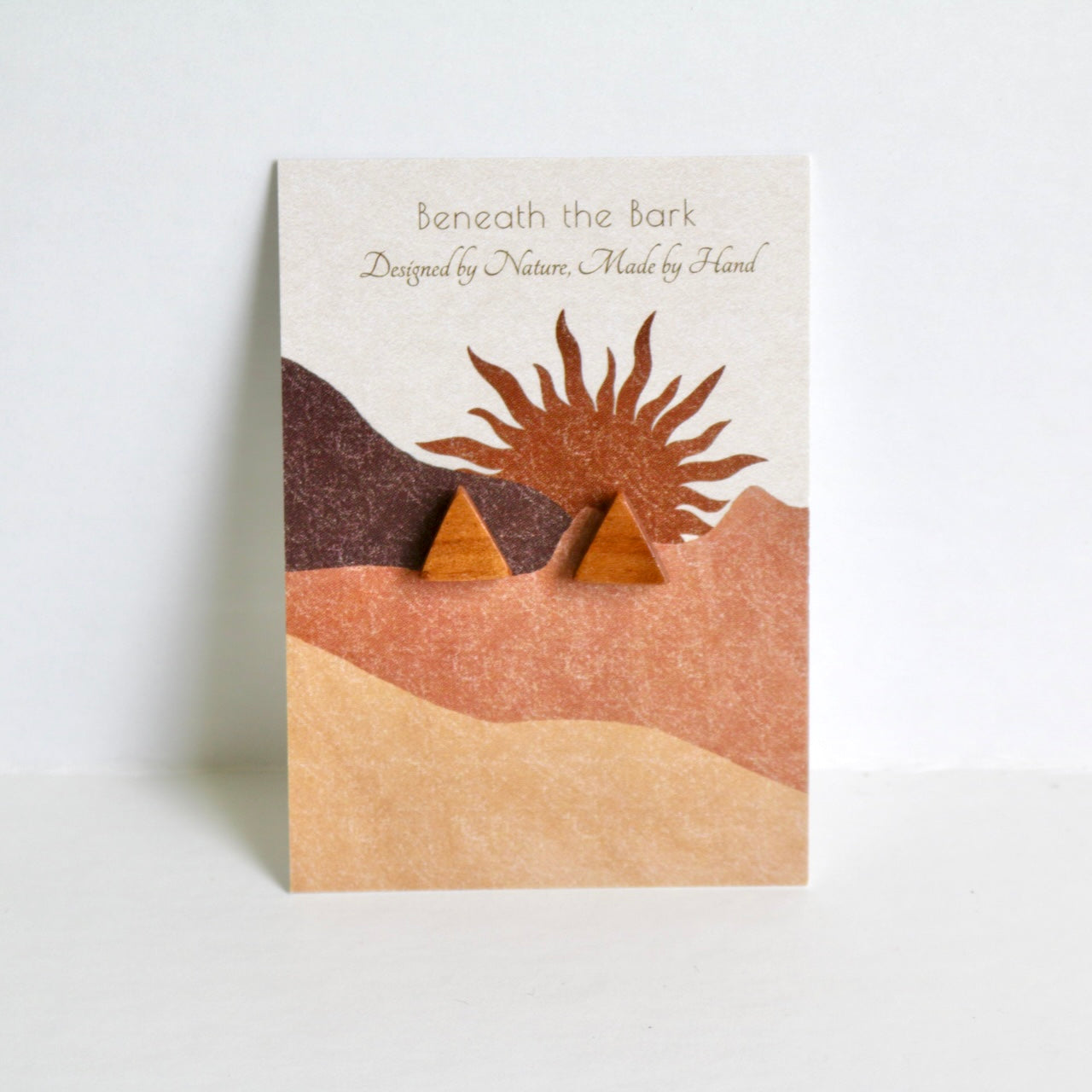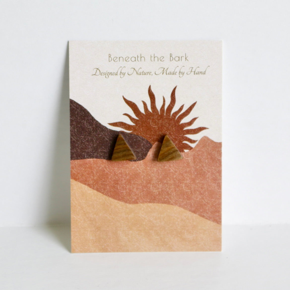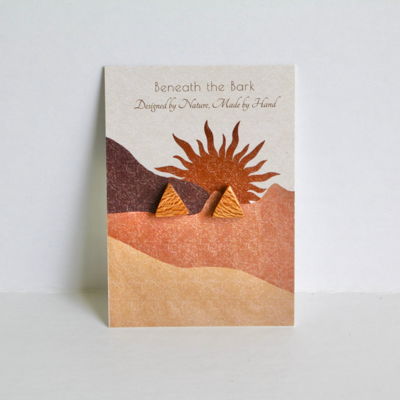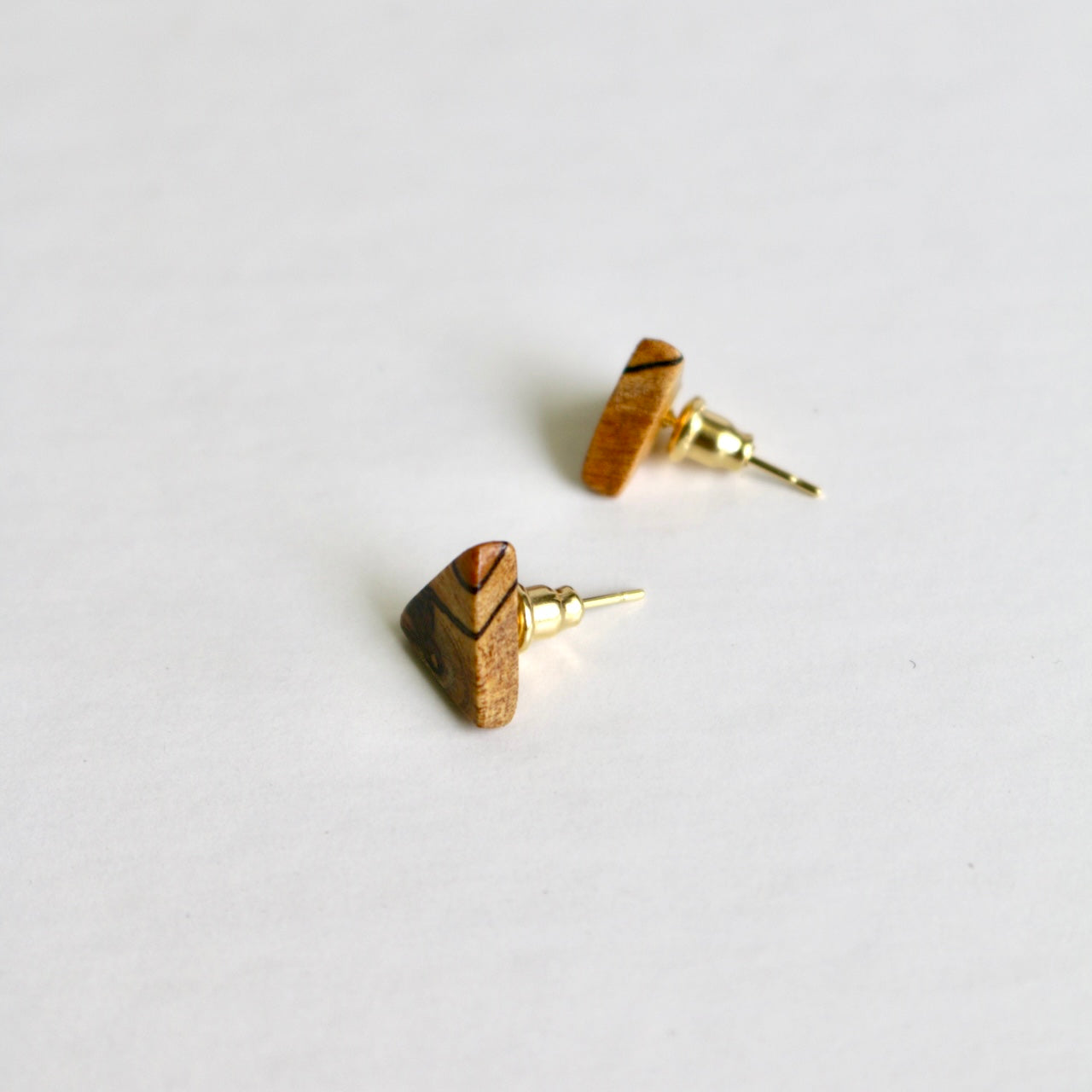 Our triangle studs are handmade using salvaged wood and measure about 8mm. These studs are made with high quality hypoallergenic 18K gold stainless steel ear posts. 14K gold filled and sterling silver available upon request.