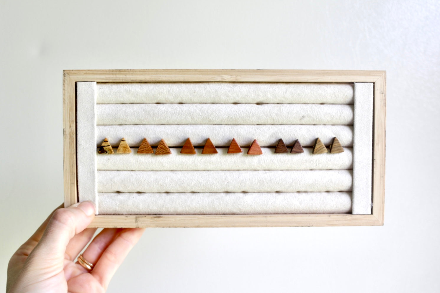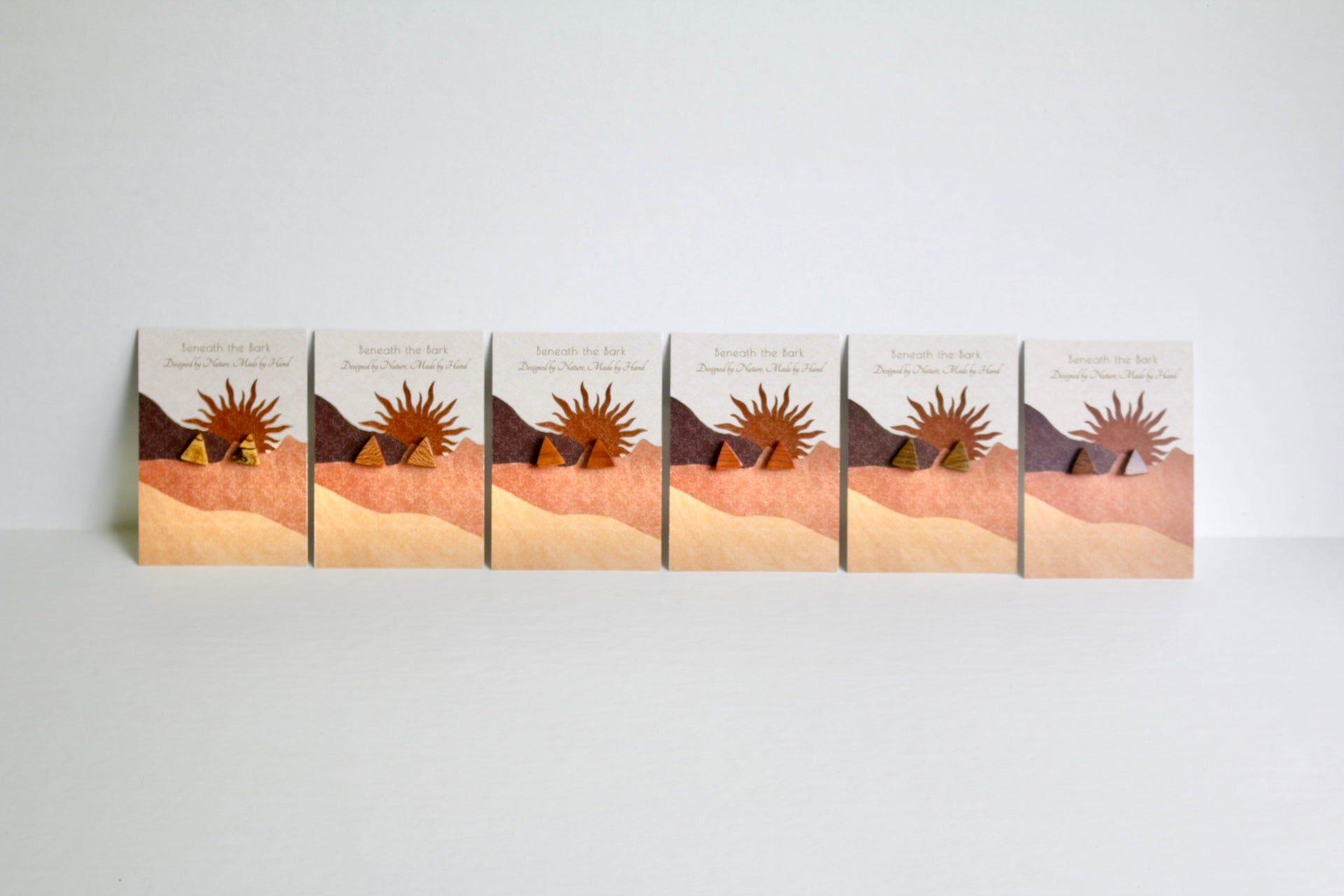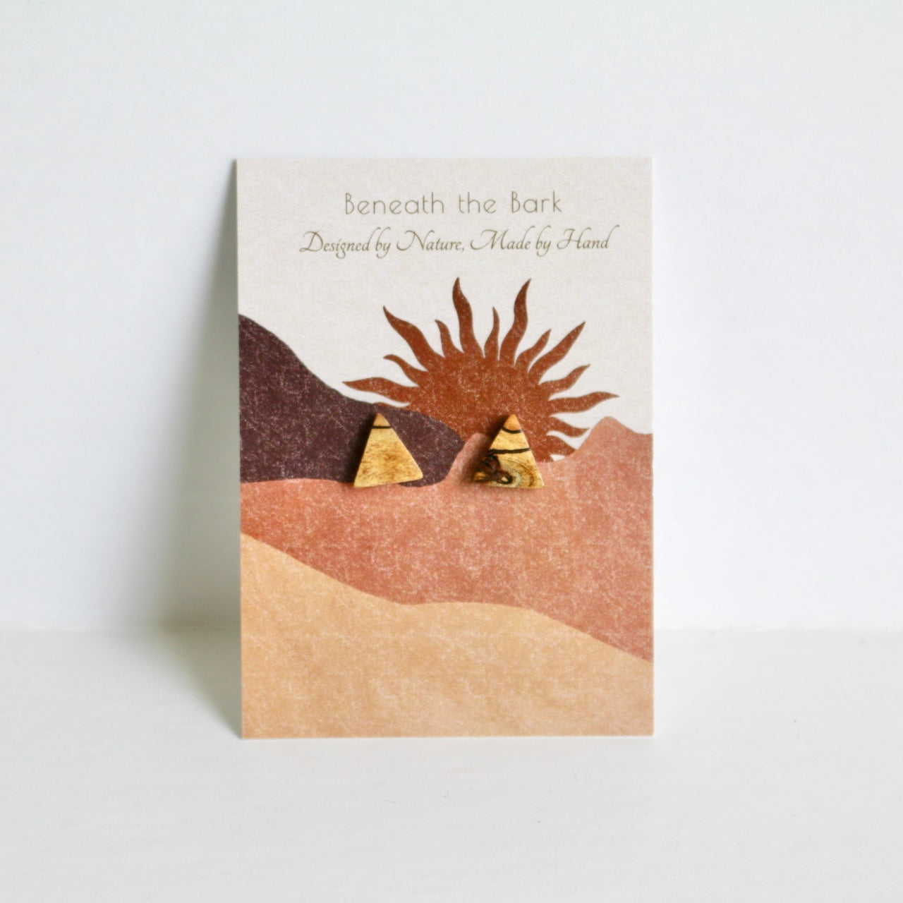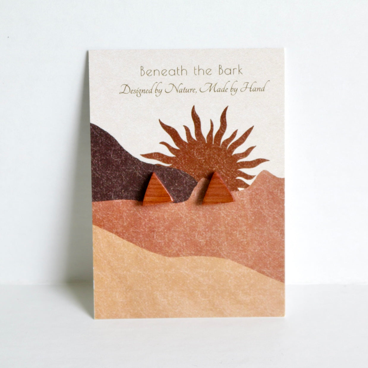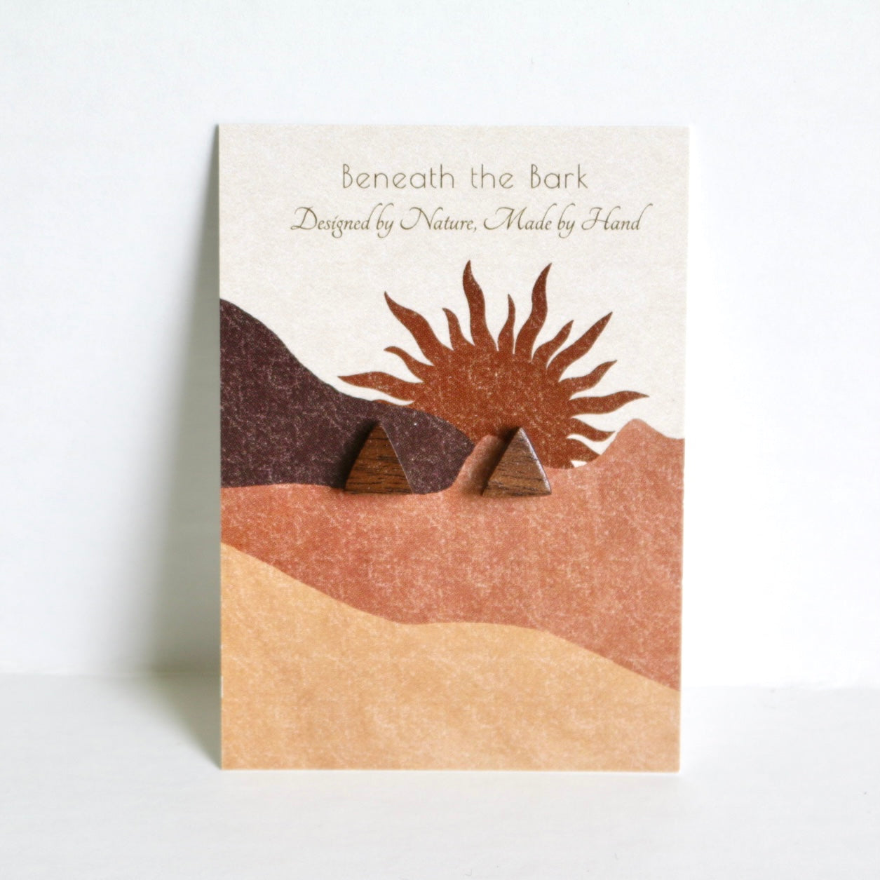 Our triangle studs are handmade using salvaged wood and measure about 8mm. These studs are made with high quality hypoallergenic 18K gold stainless steel ear posts. 14K gold filled and sterling silver available upon request.