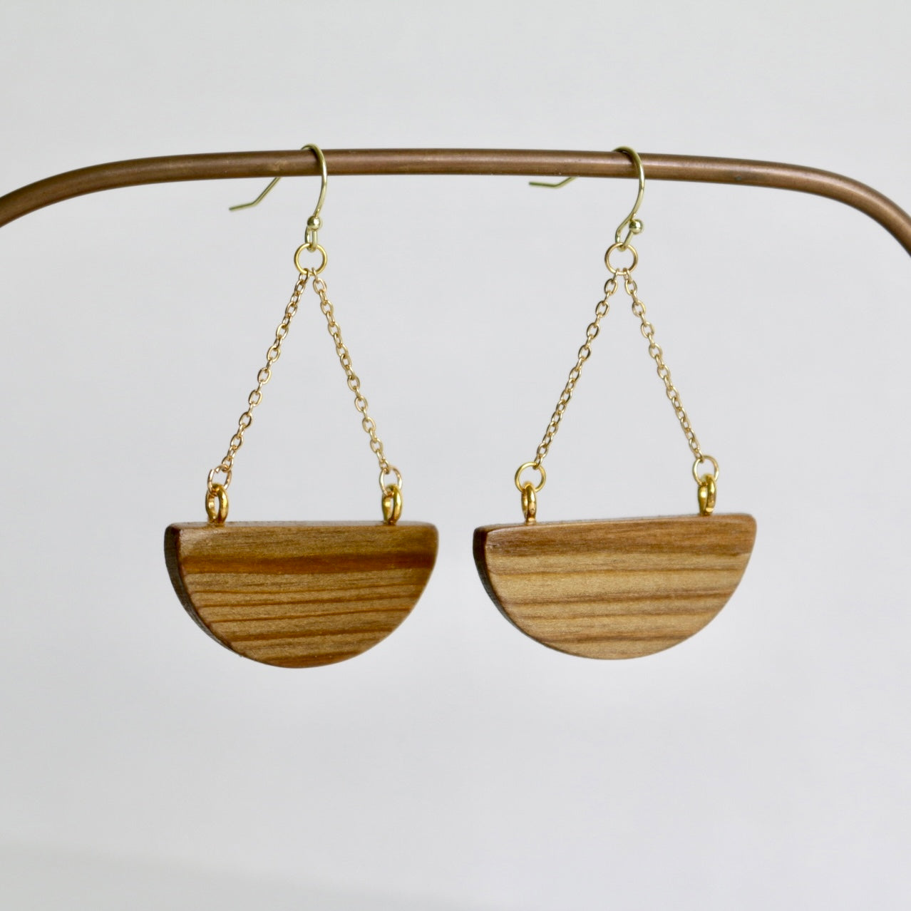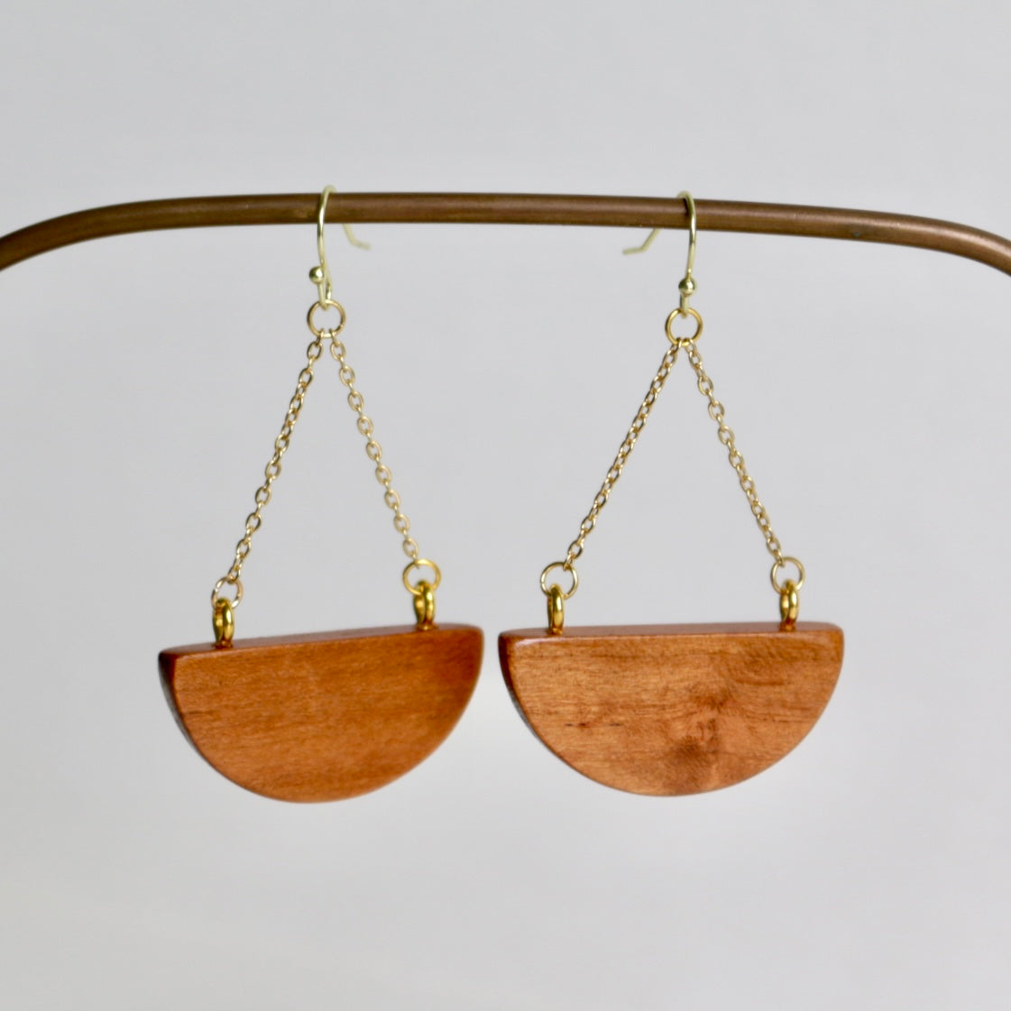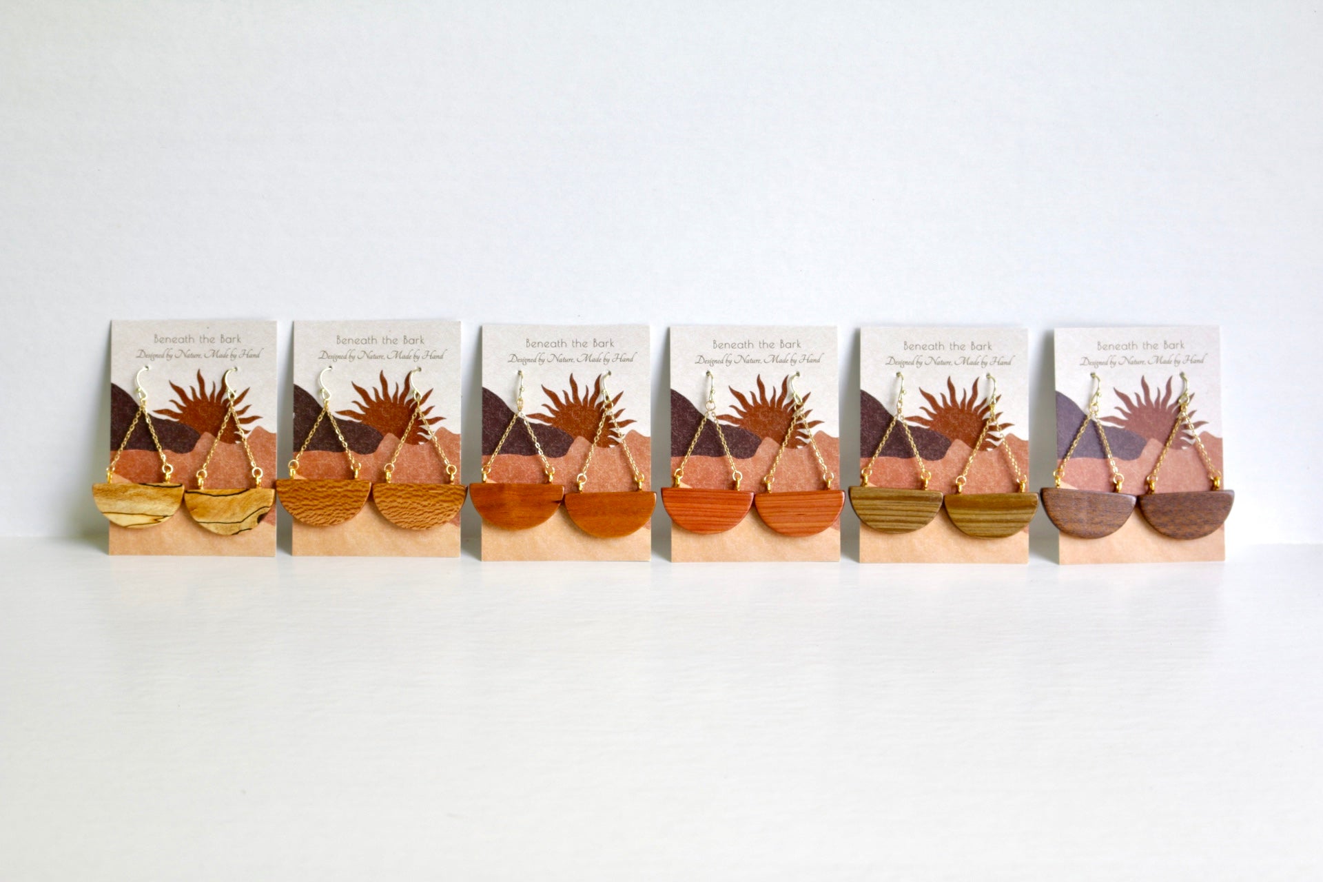 The Lilly earrings are handmade using recycled wood from local woodworkers scraps. We use high quality hypoallergenic stainless steel metals. Please note that we have upgraded to leverback earwires. 14K gold filled and sterling silver available upon request. 1.25" L x 0.75" W. Lightweight and one of a kind.