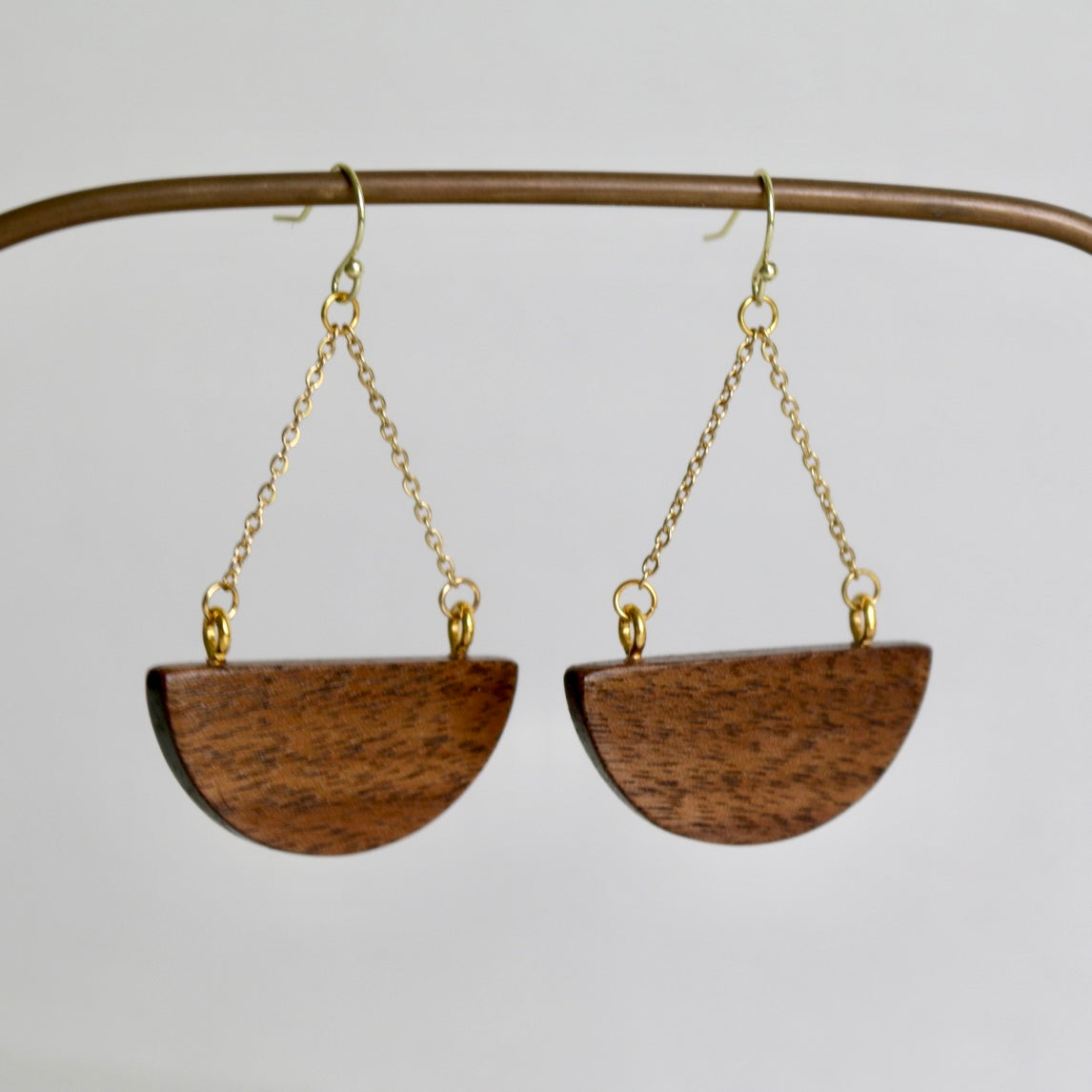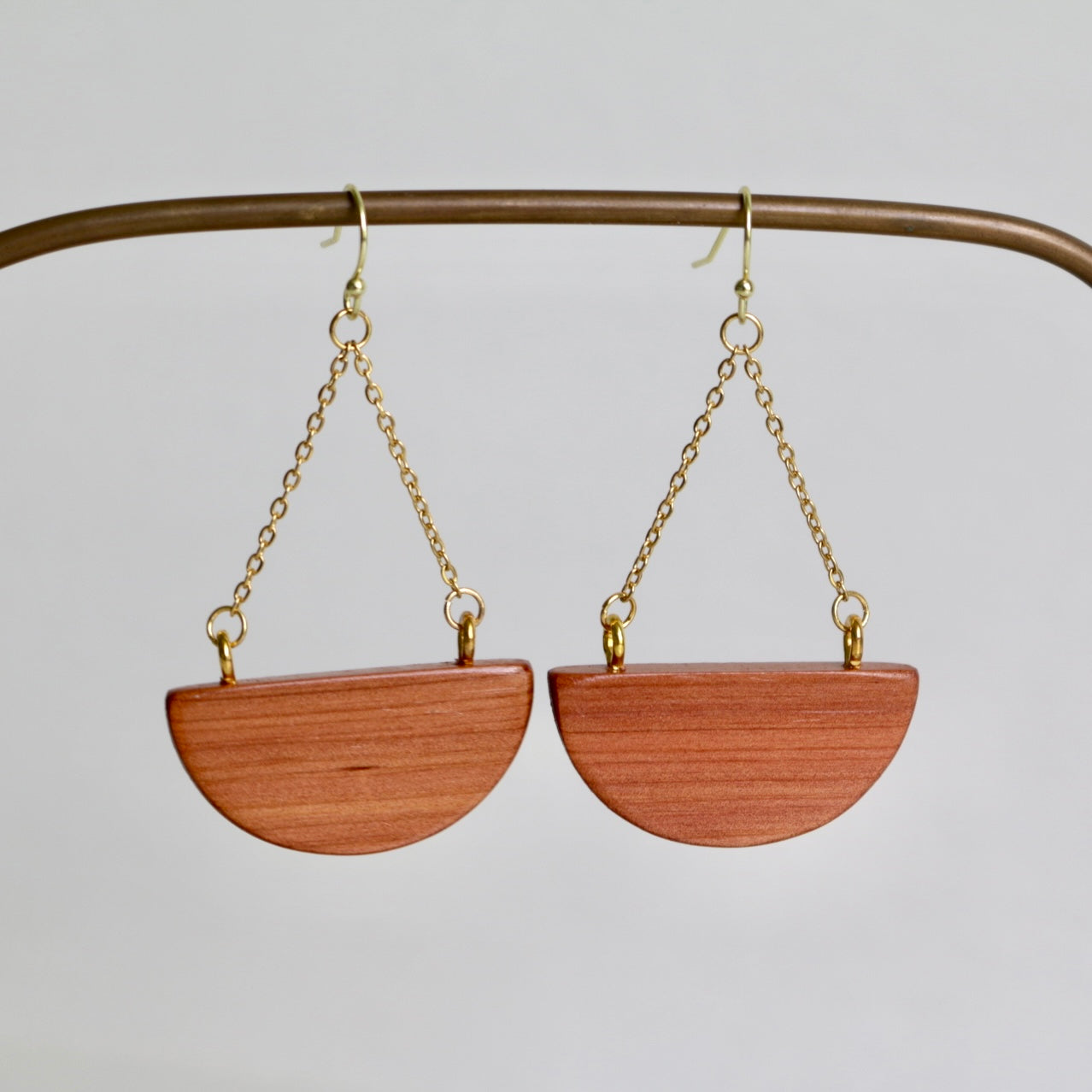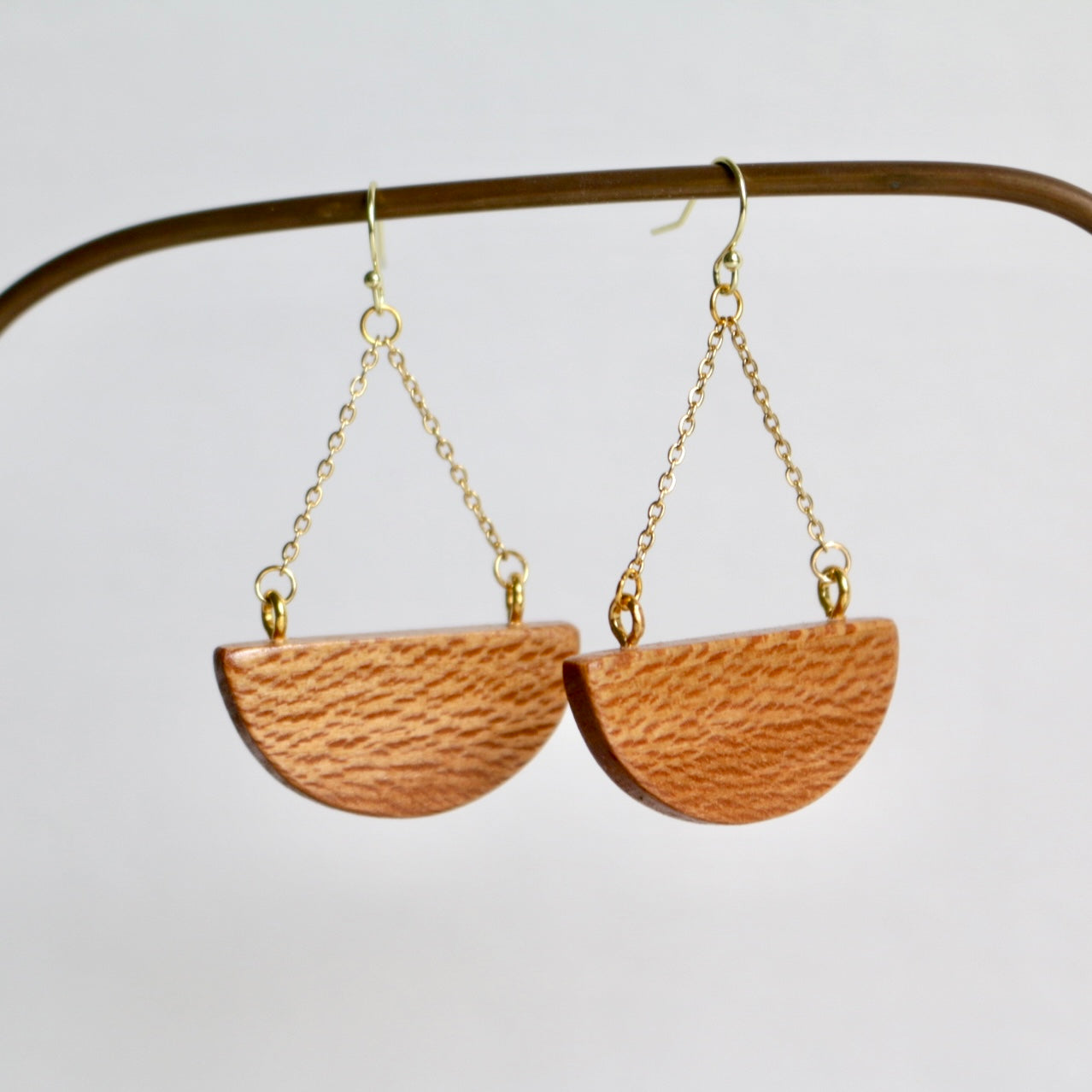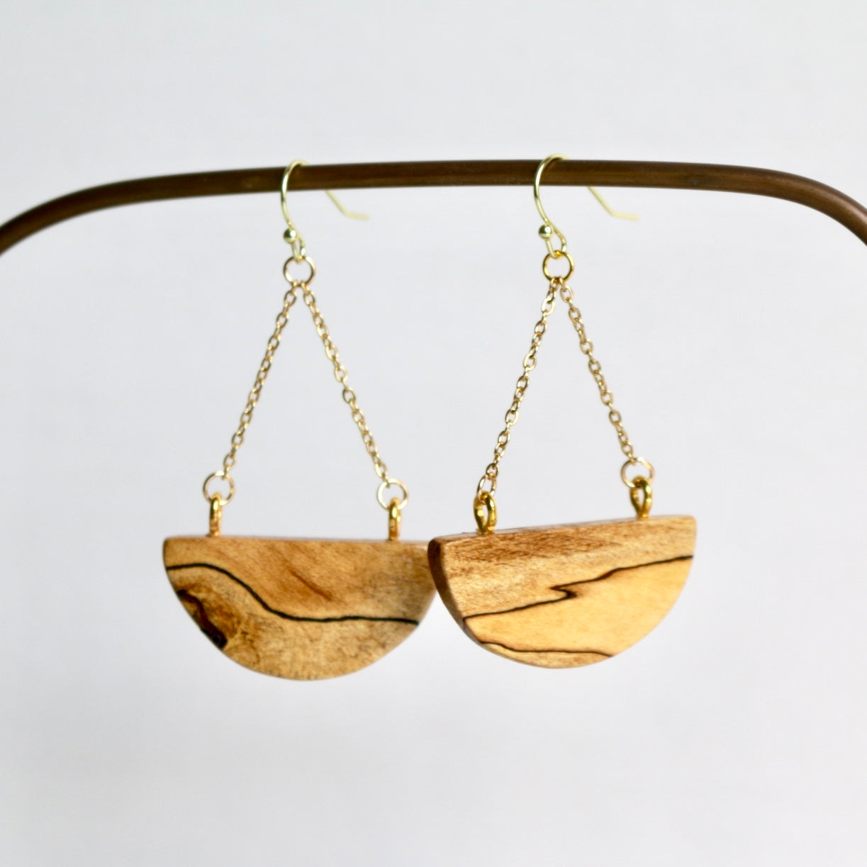 The Lilly earrings are handmade using recycled wood from local woodworkers scraps. We use high quality hypoallergenic stainless steel metals. Please note that we have upgraded to leverback earwires. 14K gold filled and sterling silver available upon request. 1.25" L x 0.75" W. Lightweight and one of a kind.